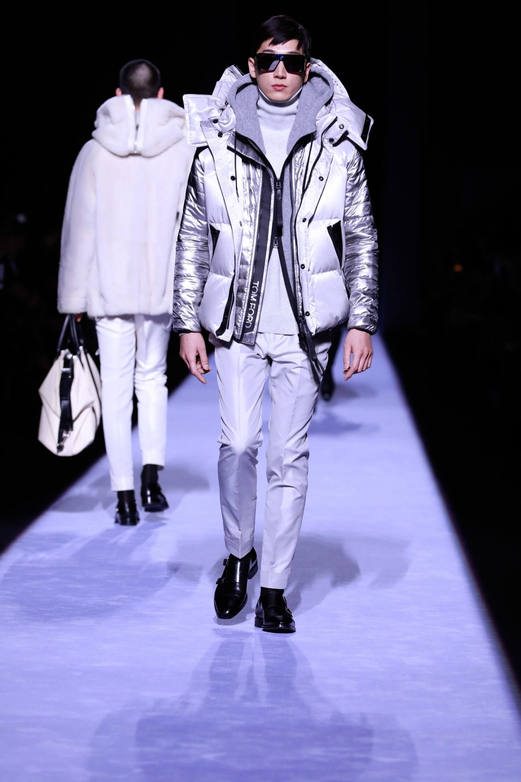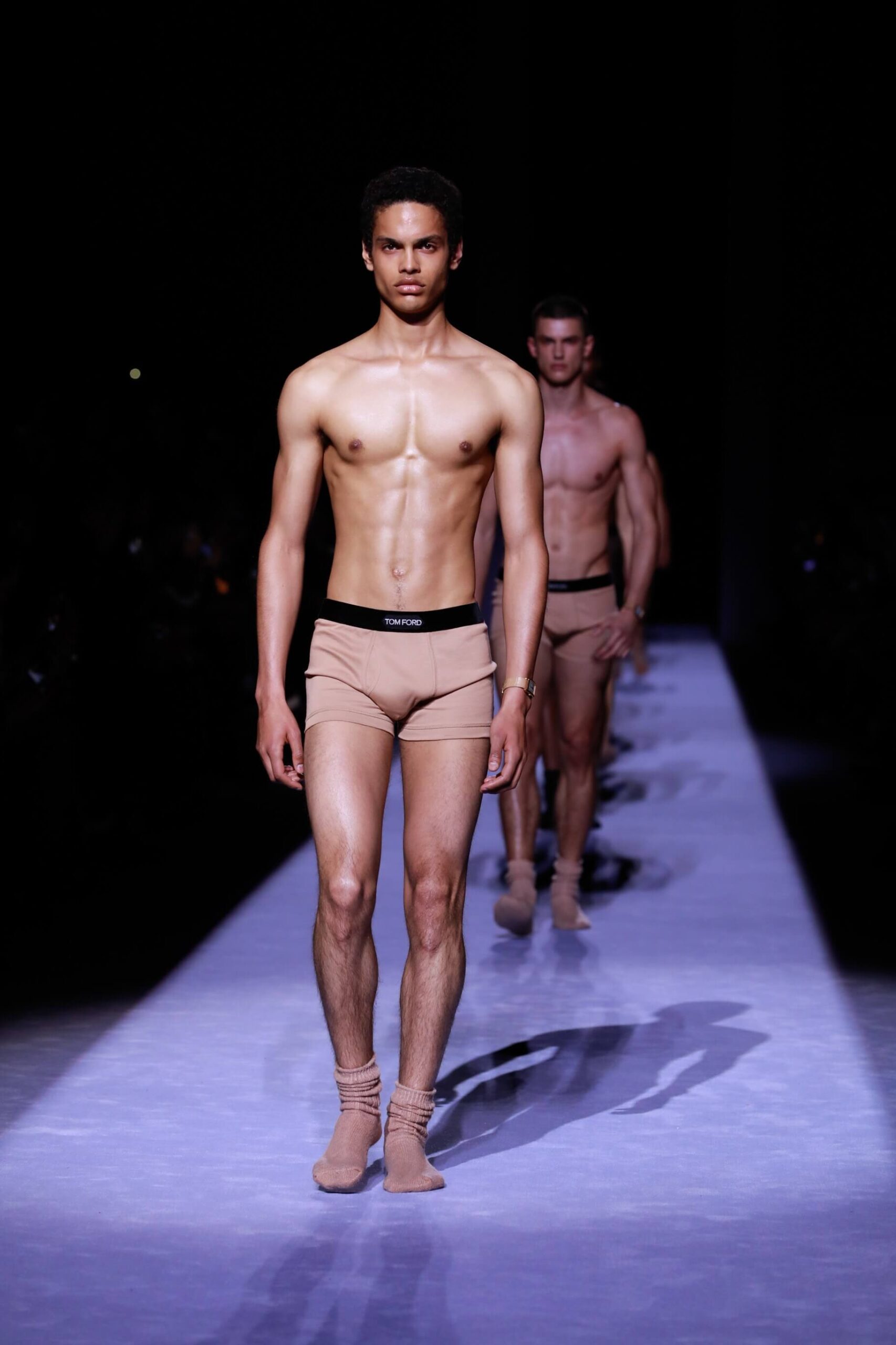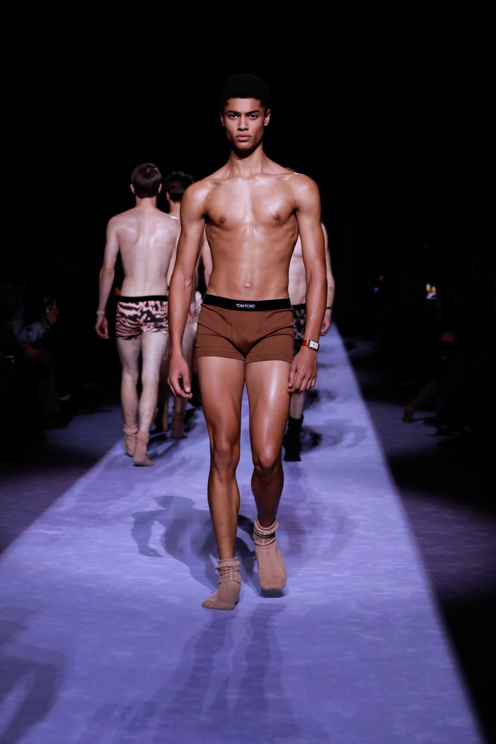 There was lots of python print, because Mr. Ford is oh so sly. And we must also talk about the puffer jackets. You see it’s officially the year of the puffer, cubic space, calling it now. Big coats, fitted suit jackets. The uniform. It was all very noble, even when they were in their underwear. And dayum they looked good. Chiseled to perfection (we’re talking about the underwear, obvs). Tom Ford branded on the waistband briefs is simply the way to go. Matched with rumpled socks. He woke up like this. And then Mr. Ford came down the runway to Lana Del Rey’s Young and Beautiful. Because we will still love the Tom Ford man even when (unlikely as it is) he’s no longer young and beautiful. As long as he’s wearing a whole lot of this. It was simply, fastidiously Tom Ford. Crisp. Now for the womenswear later this week.