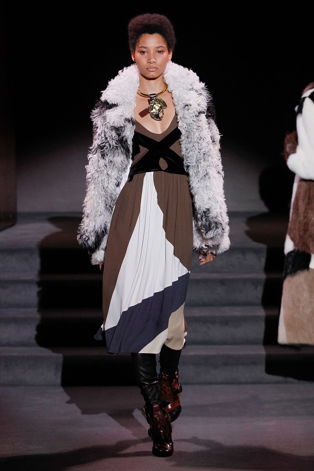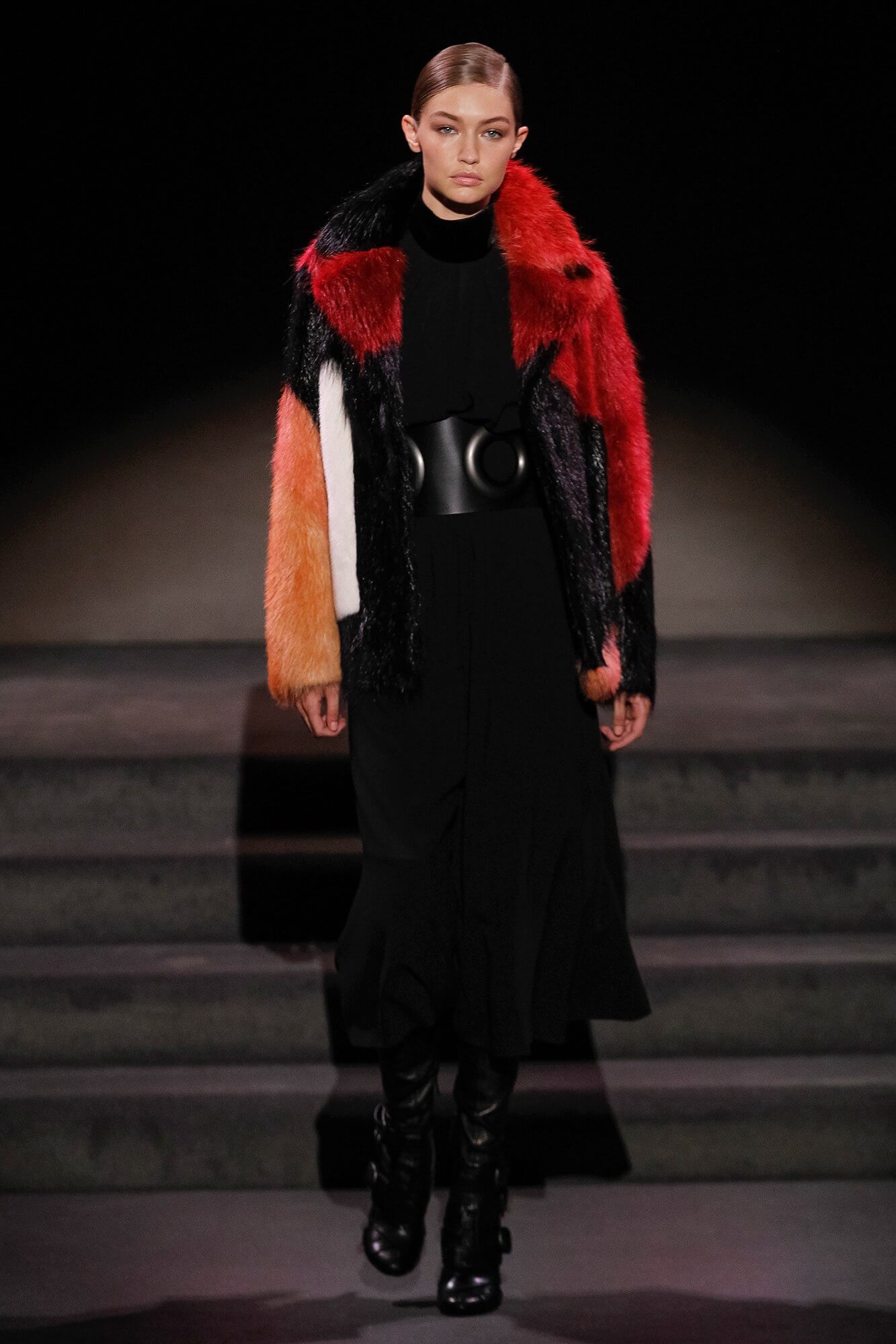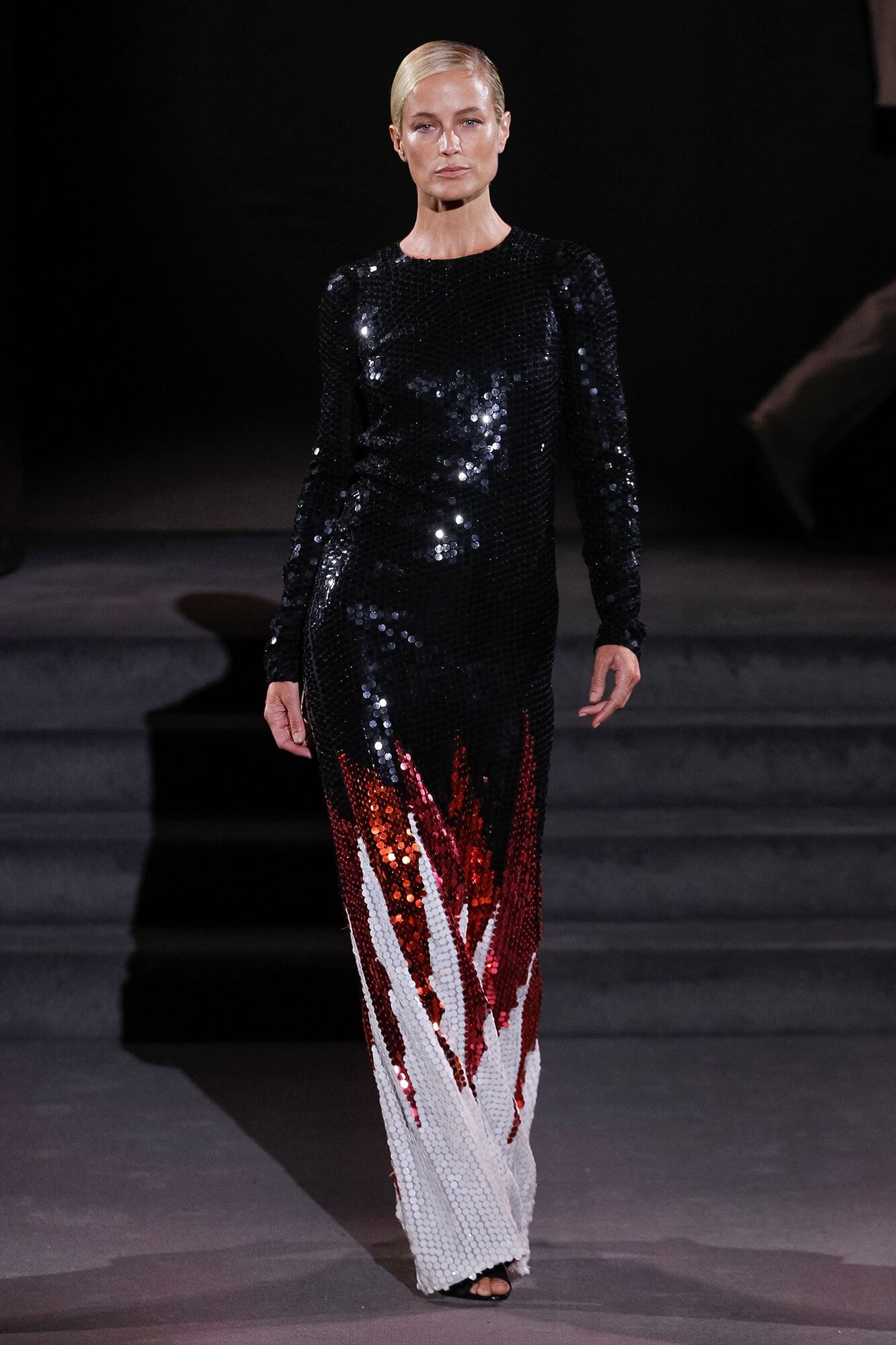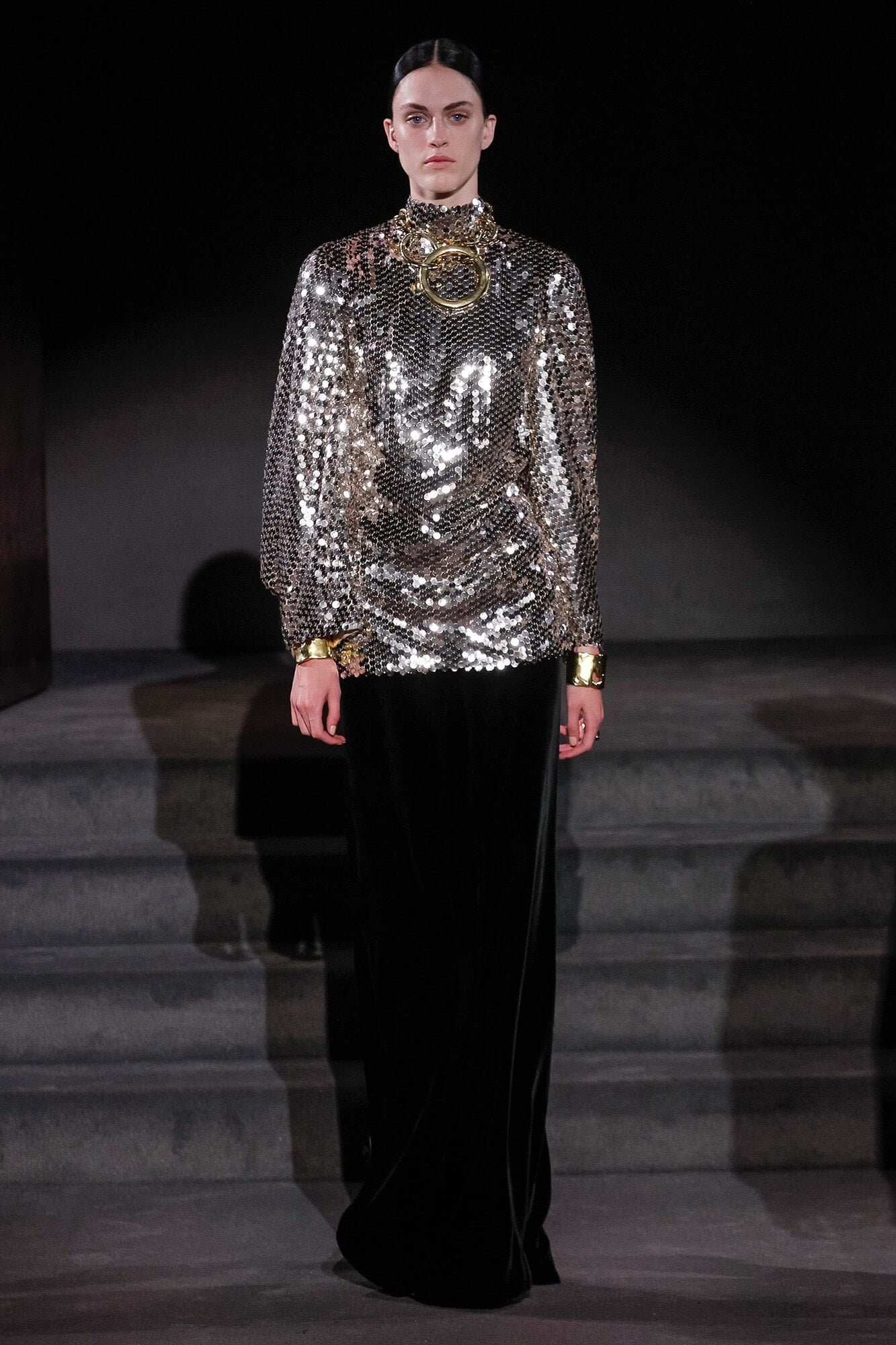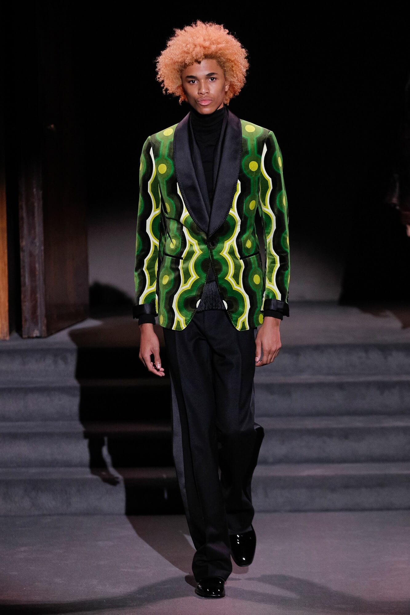 Nobody does it better, or to put it another way, nobody does Tom Ford like Tom Ford. It’s a unique gift. It might not be to everyone’s taste, but like some sort of weird vortex it sucks you into its heart every time. There’s something mesmerising about clothes that scream wealth. Insane wealth. Like Ellen Barkin squatting on the street dressed in fur with a Birkin by her feet. Watching them walk down a runway is almost hypnotic. It’s like that scene in The Jungle Book, where Kaa hypnotises Mowgli before trying to eat him. But with sequins and minus the cannibalism. And so, onto the clothes, what did these tributes to glitz and glamour look like? Think of an elegant, grown up, lady discotheque attendee slash lady sleuth. Jane Fonda in Klute. Coats were patch worked shiny leather, trimmed with fur, fuchsia in one case, and lined with leopard. Skirts were tight and came in the pencil variety and dresses were long, in velvet and sequins, and clingy. A sort of shimmering column of light reflective fabric not dissimilar to a ripple of water on a lake. As we said, hypnotic. And oddly mesmerising. A Dynasty for our times. Well, nobody watches TV anymore. We need to get our kicks from somewhere.
