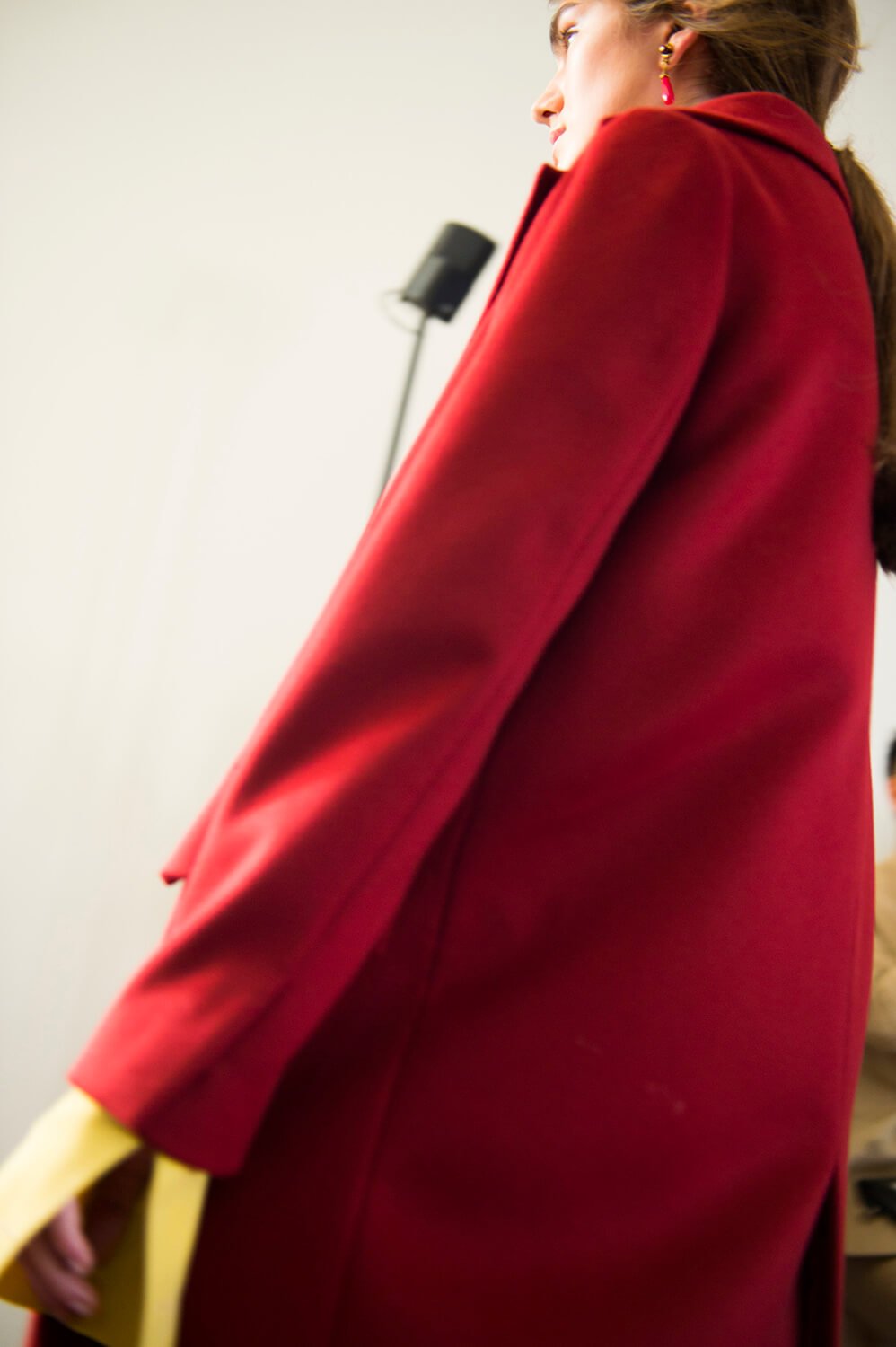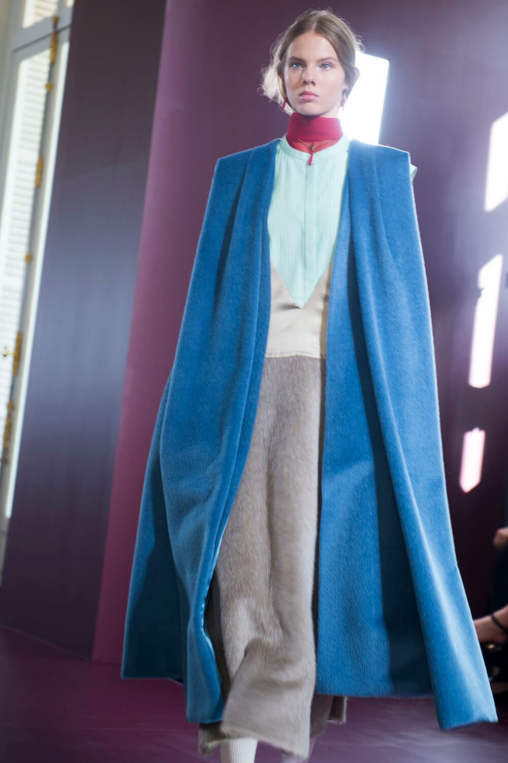 There was a sort of column silhouette to this – these monastic capes that hung perfectly off the model’s shoulders, worn with polo necks beneath, and mohair tops that flared ever so slightly from the model’s bodies. And there was something monastic too about the drape of it all – some dresses raised up into hoods, others folded down the back, echoing that same, cape-like silhouette. Sheer shirts came up long in the sleeve, some layered under perfectly cut overcoats. Of course, there were moments that veered away from that cool simplicity – curtain-like fabrics, dotted with animals, opened up at the sides to reveal slices of hot pink sheet fabric, whilst those same animals became hanging metal bags – lions, cheetahs, owls.