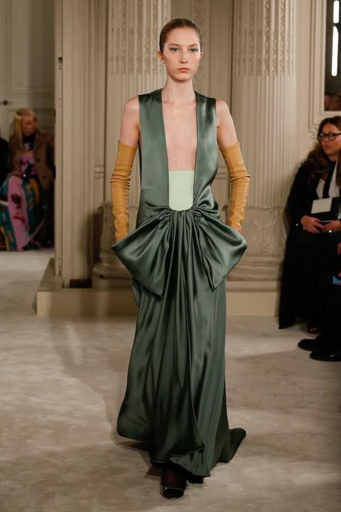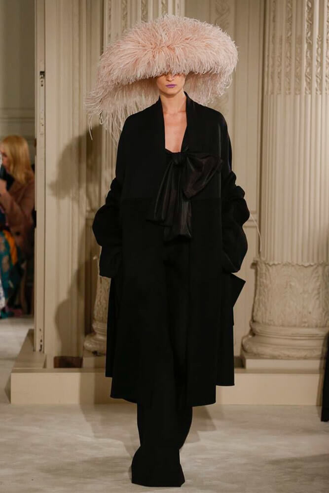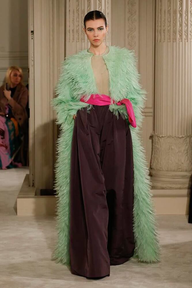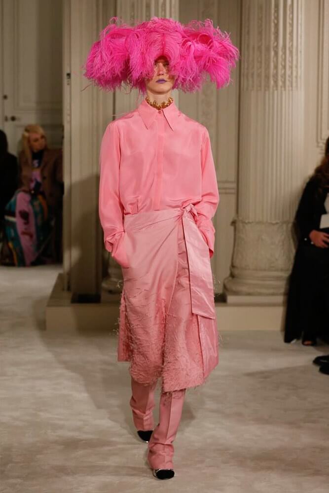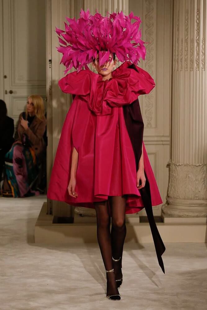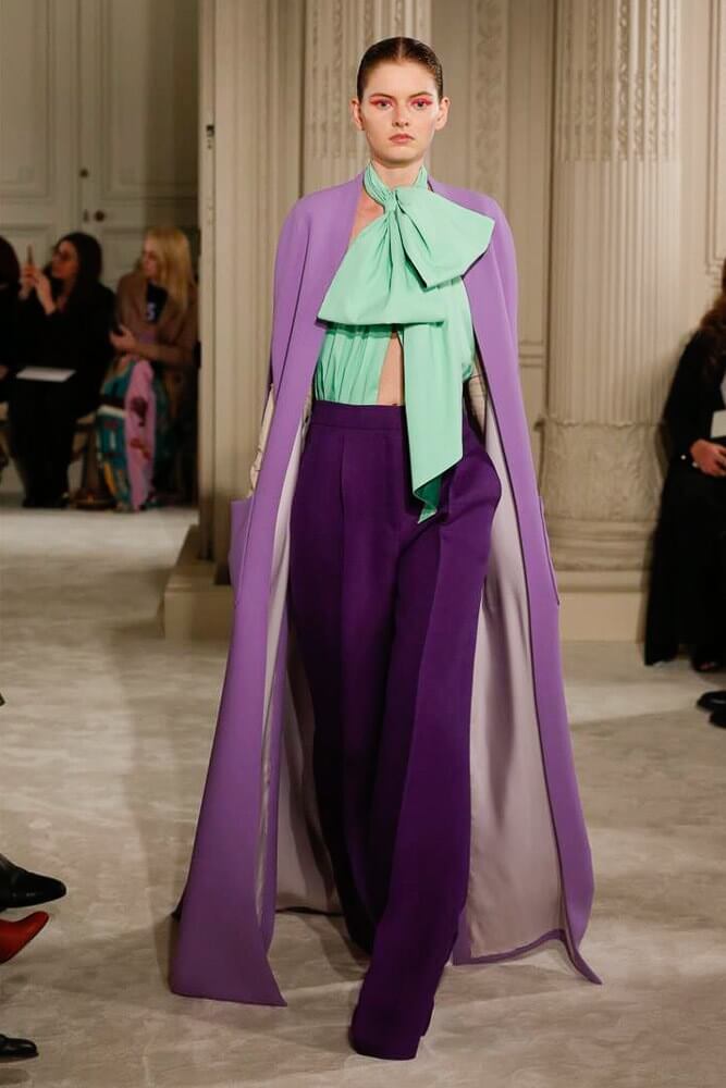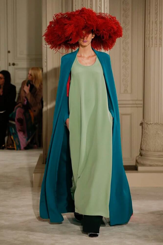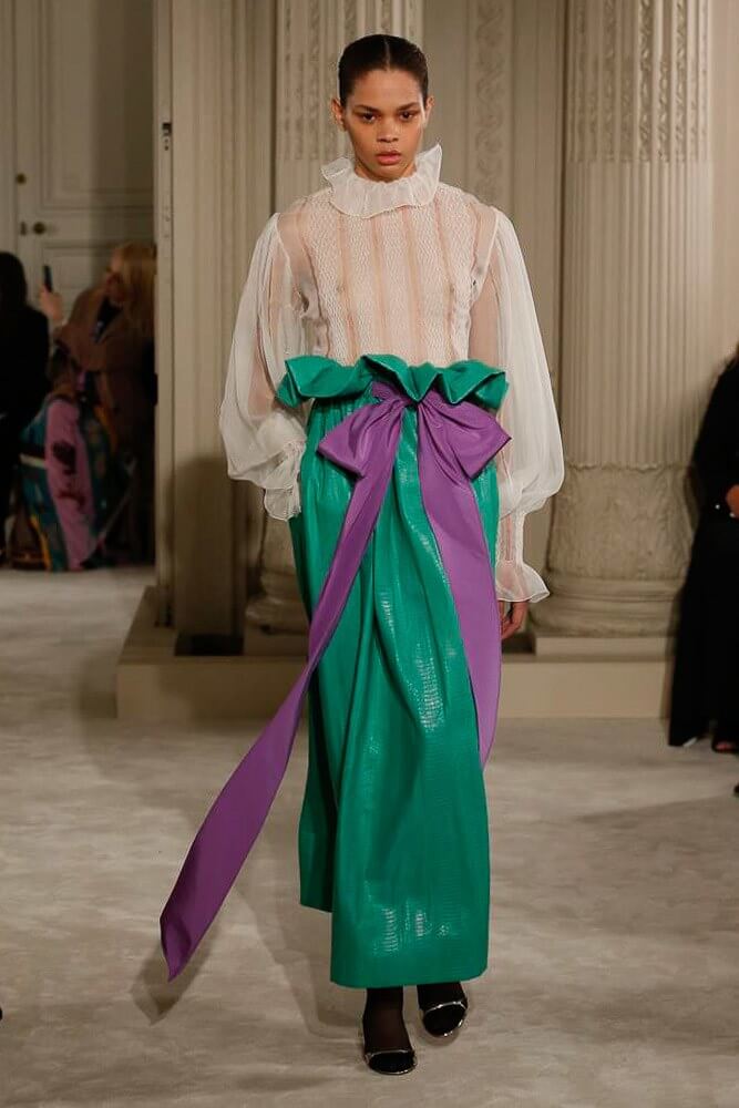 The most incredible colour combinations of couture week. Mint green met a blackcurrant purple and faded to mulberry, always ever so soft. The intensity of shocking raspberry pink, followed by chartreuse, and the Valentino signature- reds so rich and deep. The foil of ancient frescoes, kept it grounded, the whole lot inspired by Andrea Pontormo’s 16th century colour palette. The pieces reverberated through passionate colours. Swaggering details. Bows, like prom dress sashes hung loosely to the side or tied at the back. The hats, larger than life, feathers oscillating with each step designed by Philip Treacy made the drama. Oh, the drama.