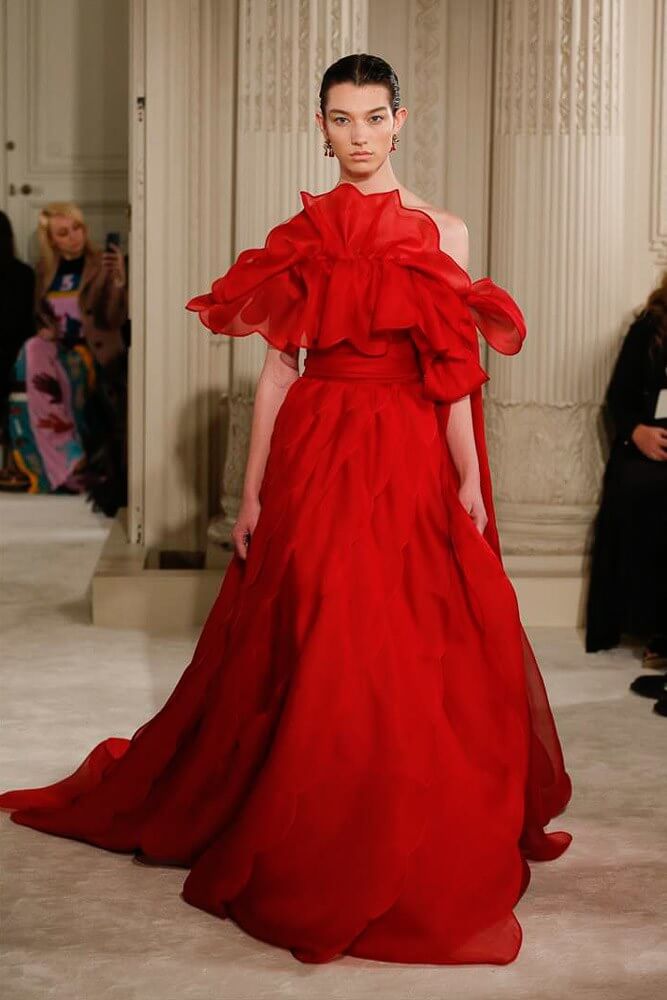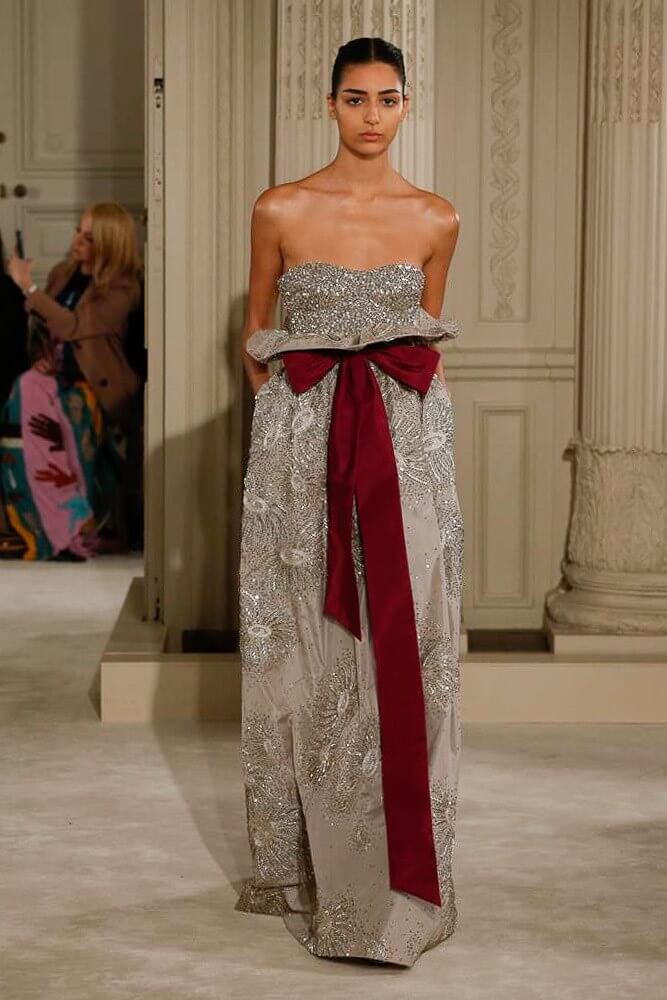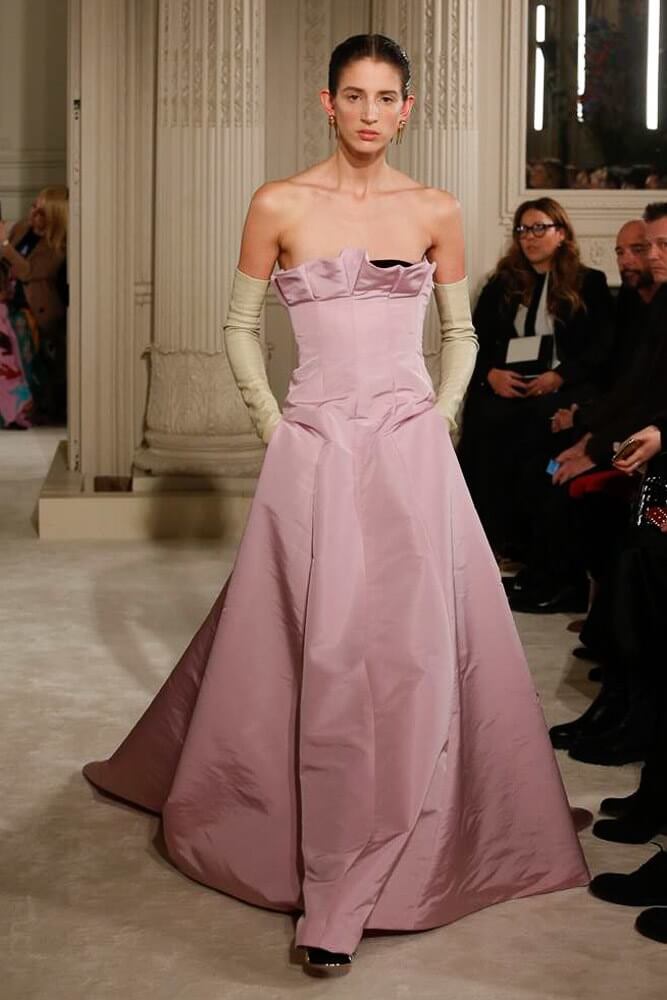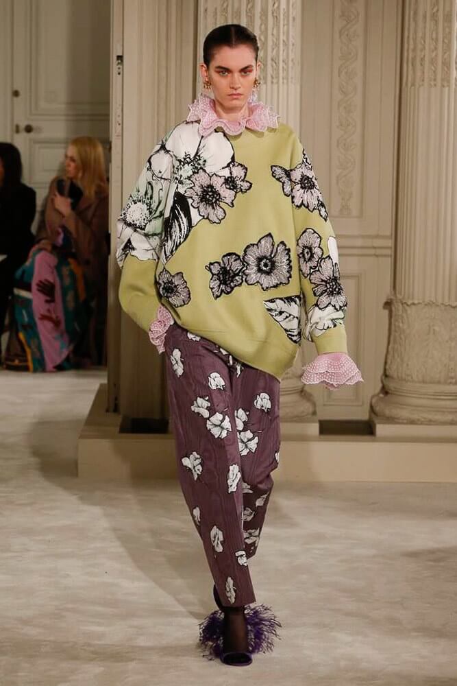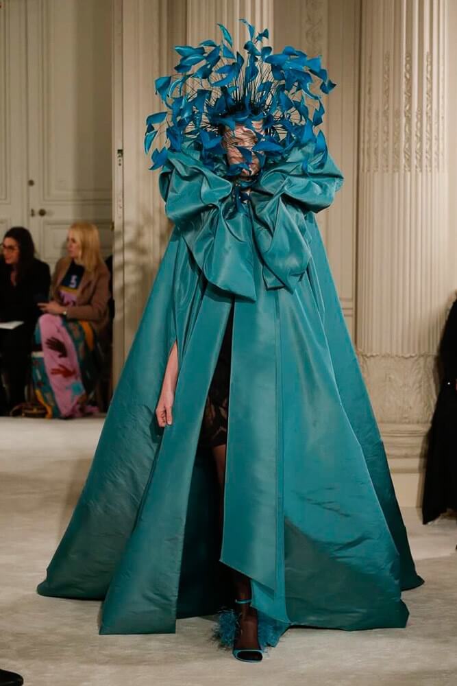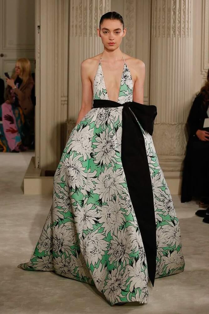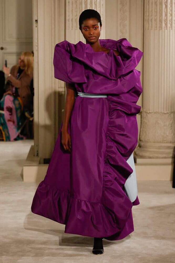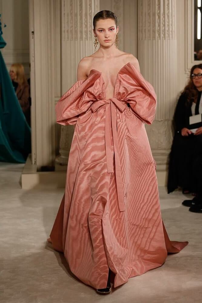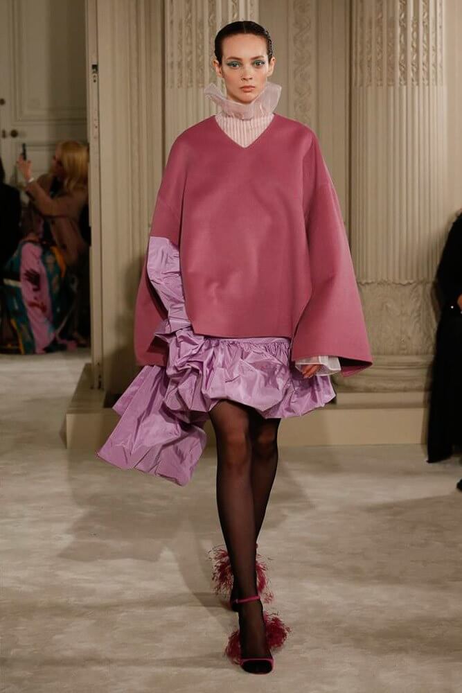 The most incredible colour combinations of couture week. Mint green met a blackcurrant purple and faded to mulberry, always ever so soft. The intensity of shocking raspberry pink, followed by chartreuse, and the Valentino signature- reds so rich and deep. The foil of ancient frescoes, kept it grounded, the whole lot inspired by Andrea Pontormo’s 16th century colour palette. The pieces reverberated through passionate colours. Swaggering details. Bows, like prom dress sashes hung loosely to the side or tied at the back. The hats, larger than life, feathers oscillating with each step designed by Philip Treacy made the drama. Oh, the drama.