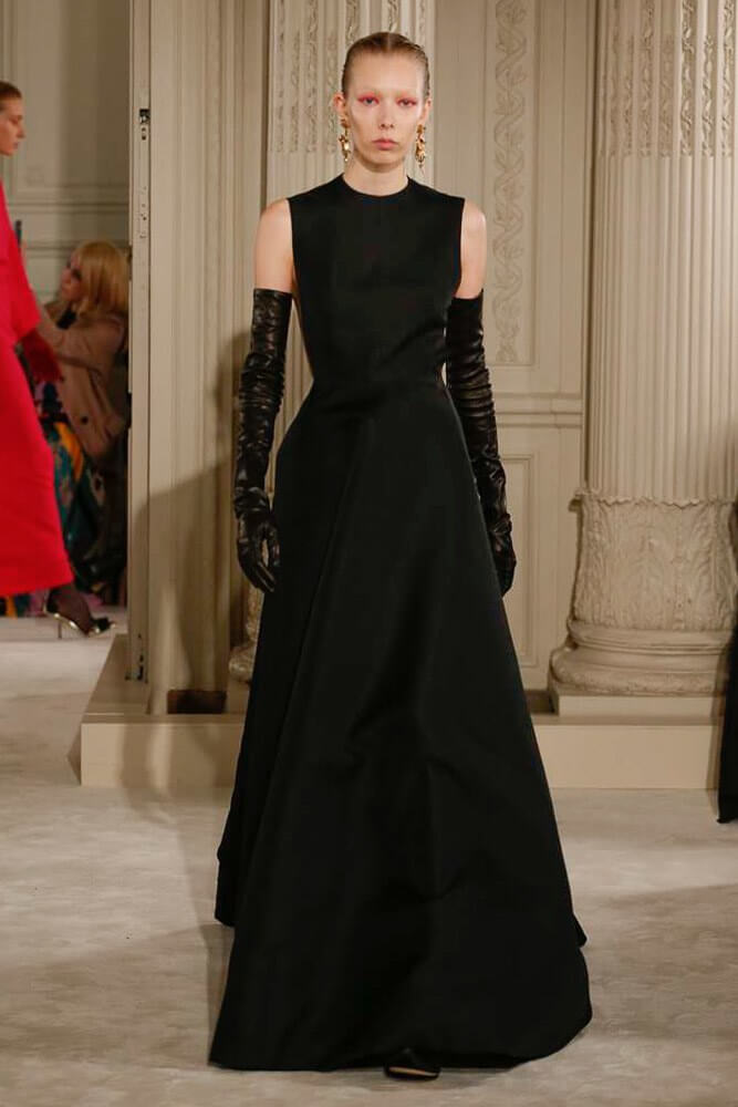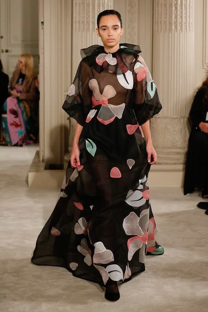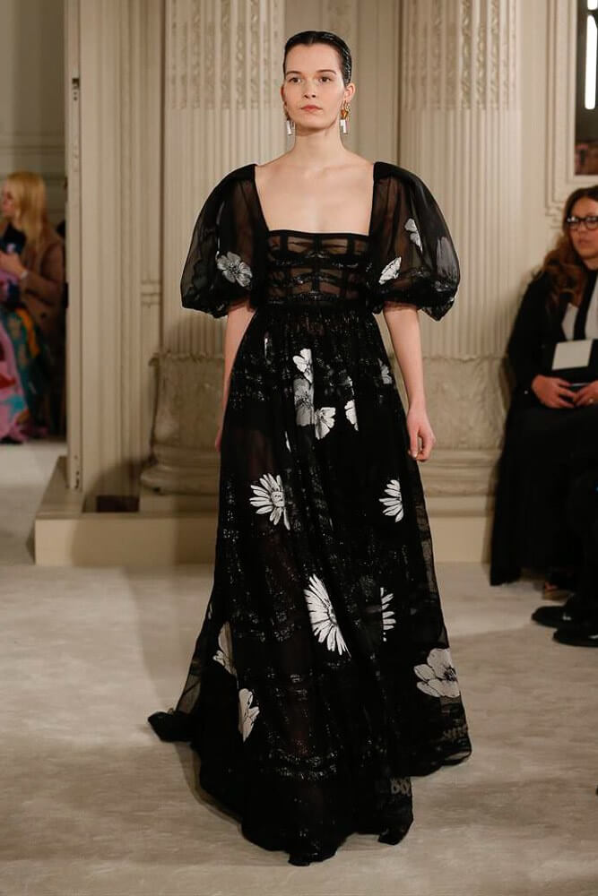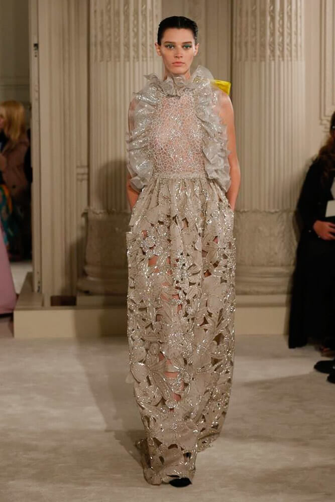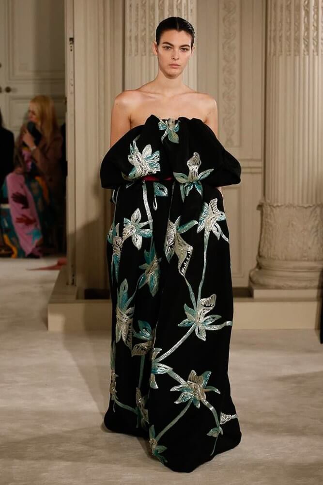 Exaggeration handled so eloquently. Each piece harmoniously confronted the next. And then, that moment, the deep dive of the first black dress, a sharp intake of breath, bridging into the romance of etched giant flower prints. Taffetas and moiré, acres of fabric handled so lightly, scooped up with ease. A tenderness to it all. Lady Duff Gordon was inspo. Important Fact: the British designer, known as Lucille, survived the sinking of the Titanic in 1912. Just saying. She’s a survivor. This was Pierpaolo Piccioli’s vision coming to life through the Valentino atelier “a continuous dialogue between the one who imagines and the one who completes.” A poetry of modern couture. This is how it should be.
