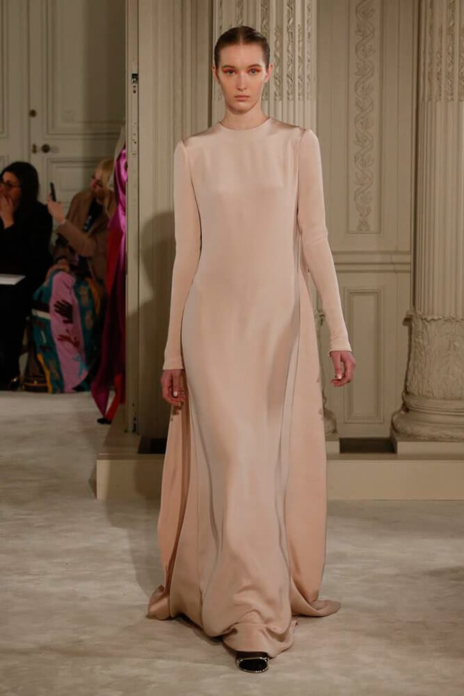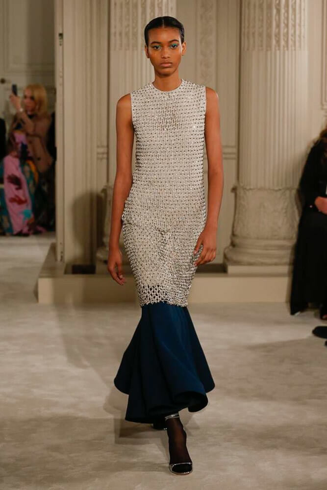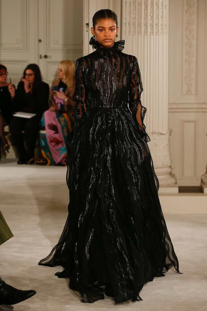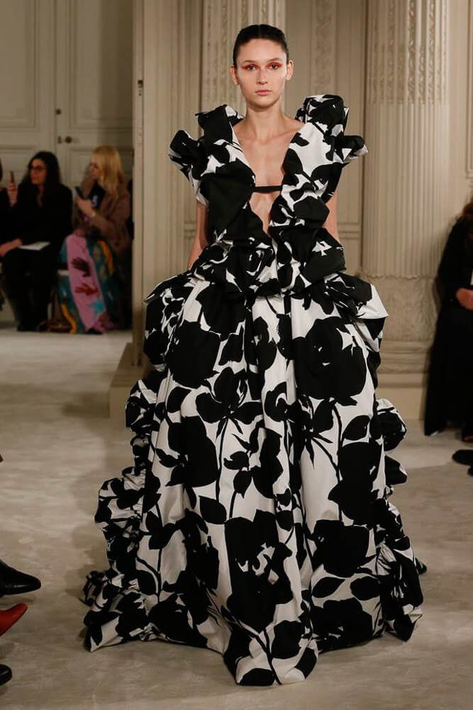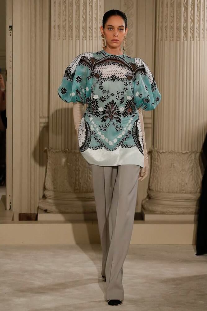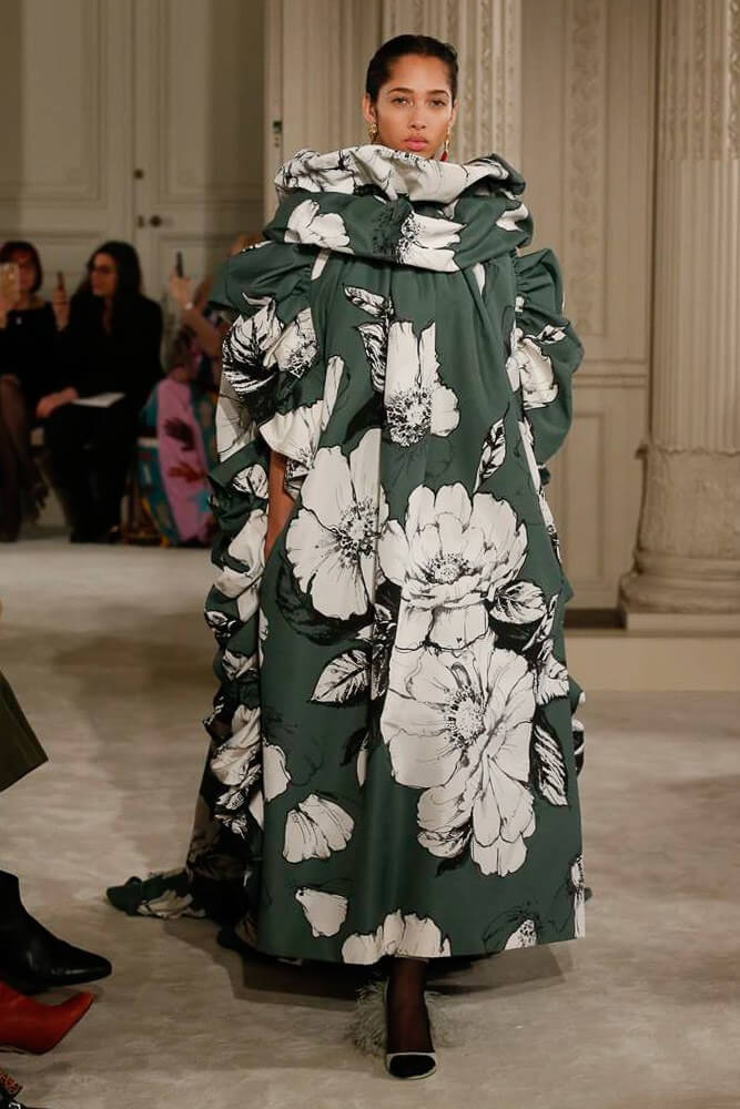 Exaggeration handled so eloquently. Each piece harmoniously confronted the next. And then, that moment, the deep dive of the first black dress, a sharp intake of breath, bridging into the romance of etched giant flower prints. Taffetas and moiré, acres of fabric handled so lightly, scooped up with ease. A tenderness to it all. Lady Duff Gordon was inspo. Important Fact: the British designer, known as Lucille, survived the sinking of the Titanic in 1912. Just saying. She’s a survivor. This was Pierpaolo Piccioli’s vision coming to life through the Valentino atelier “a continuous dialogue between the one who imagines and the one who completes.” A poetry of modern couture. This is how it should be.