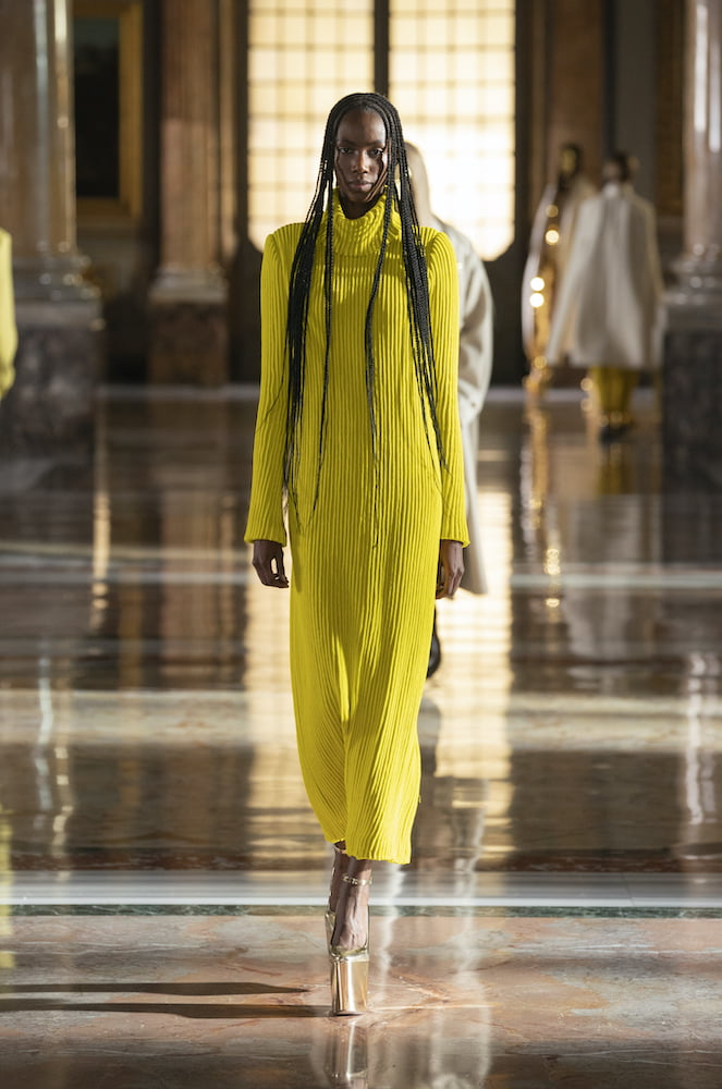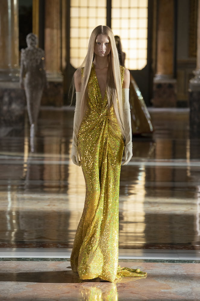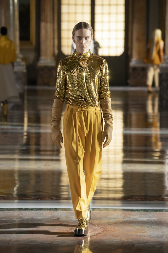 Appropriately, he called upon Massive Attack’s Robert del Naja to soundtrack his experience. His look? An almost academic purity of line, bedazzled with fluro iridescence and seasoned with the heroic grandeur of a rock-opera, in space. Models, their faces painted golden, walked the full length of Rome’s Galleria Colonna’s Salla Grande a gilded, marble interior that is impossibly rich with art, craft and history. Valentino’s model’s balanced on metallic platform boots, wearing tinsel capes, silver sequin turtlenecks and devastatingly simple columns. It’s a look Piccioli described as “Vibrant simplicity,” not just because of the piquant colours, but the fact that the intimate, up-close experience of these pieces and their vivid-hand made textures tells a richer story than the far away optics.