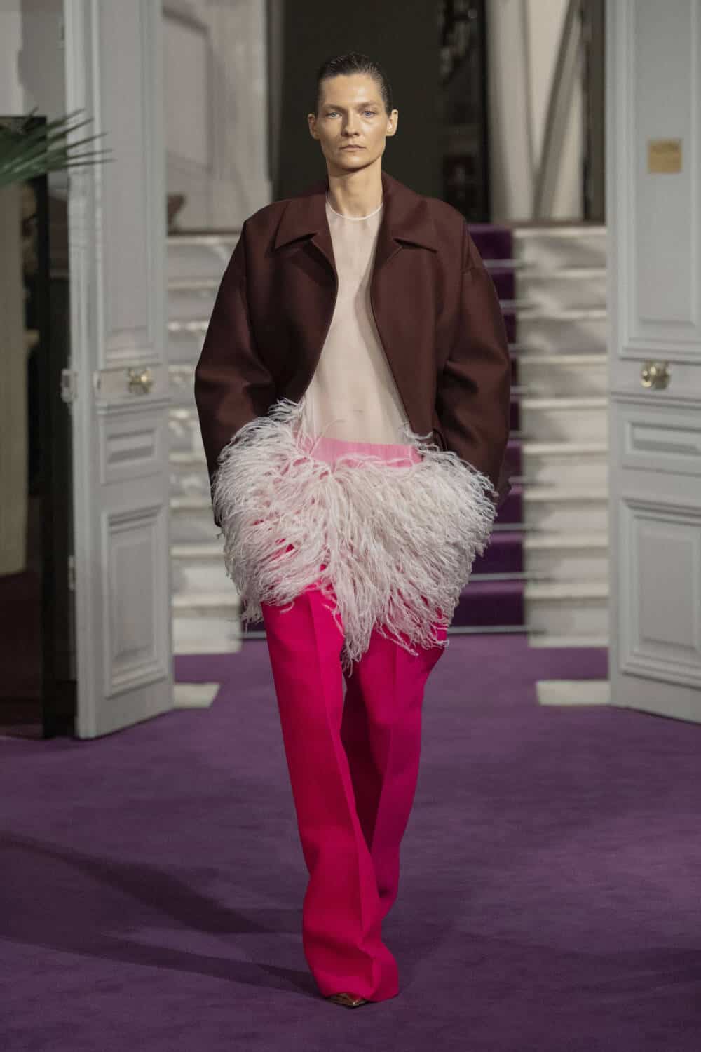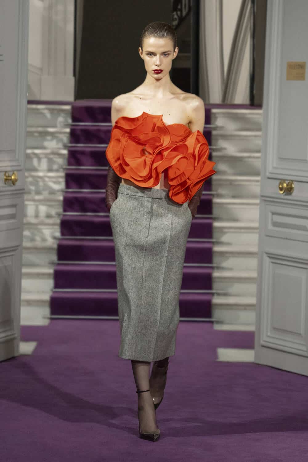 Piccioli’s couture is not only a feast for the eyes, but an adventure for all the senses. The Valentino atelier crafted a collection that doubled as a textural buffet. The team mastered silk, satin and wool to resemble fur, feathers and exotic skins. What appeared to be a croc coat, for instance, was hand-embossed leather, and elegant faux furs were actually crafted from organza.