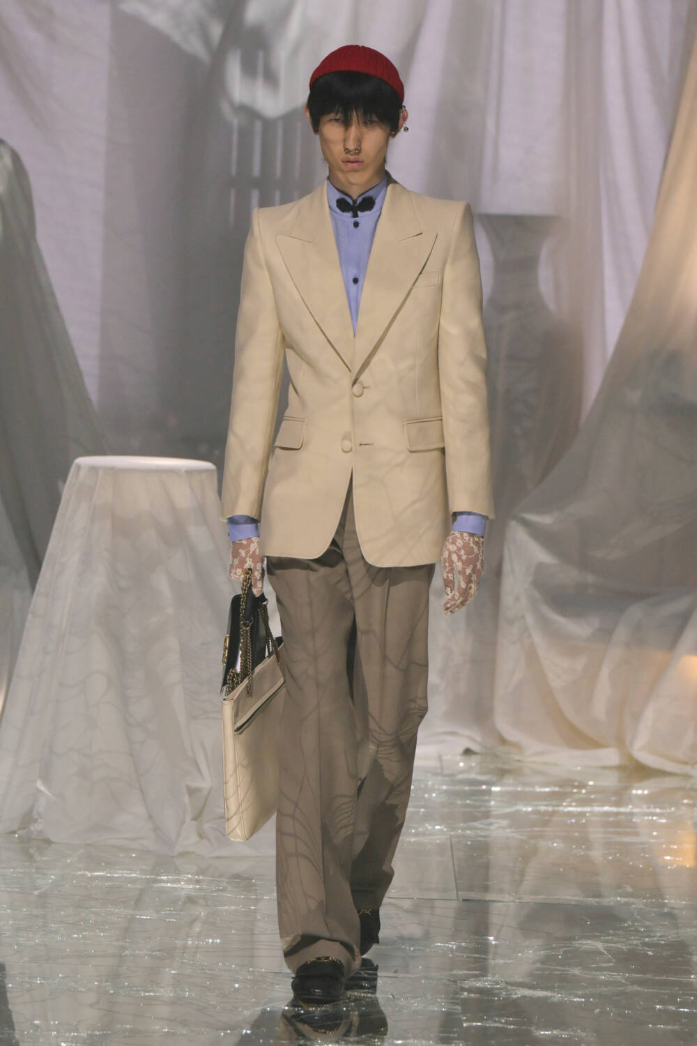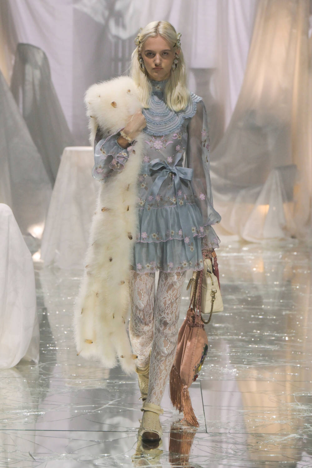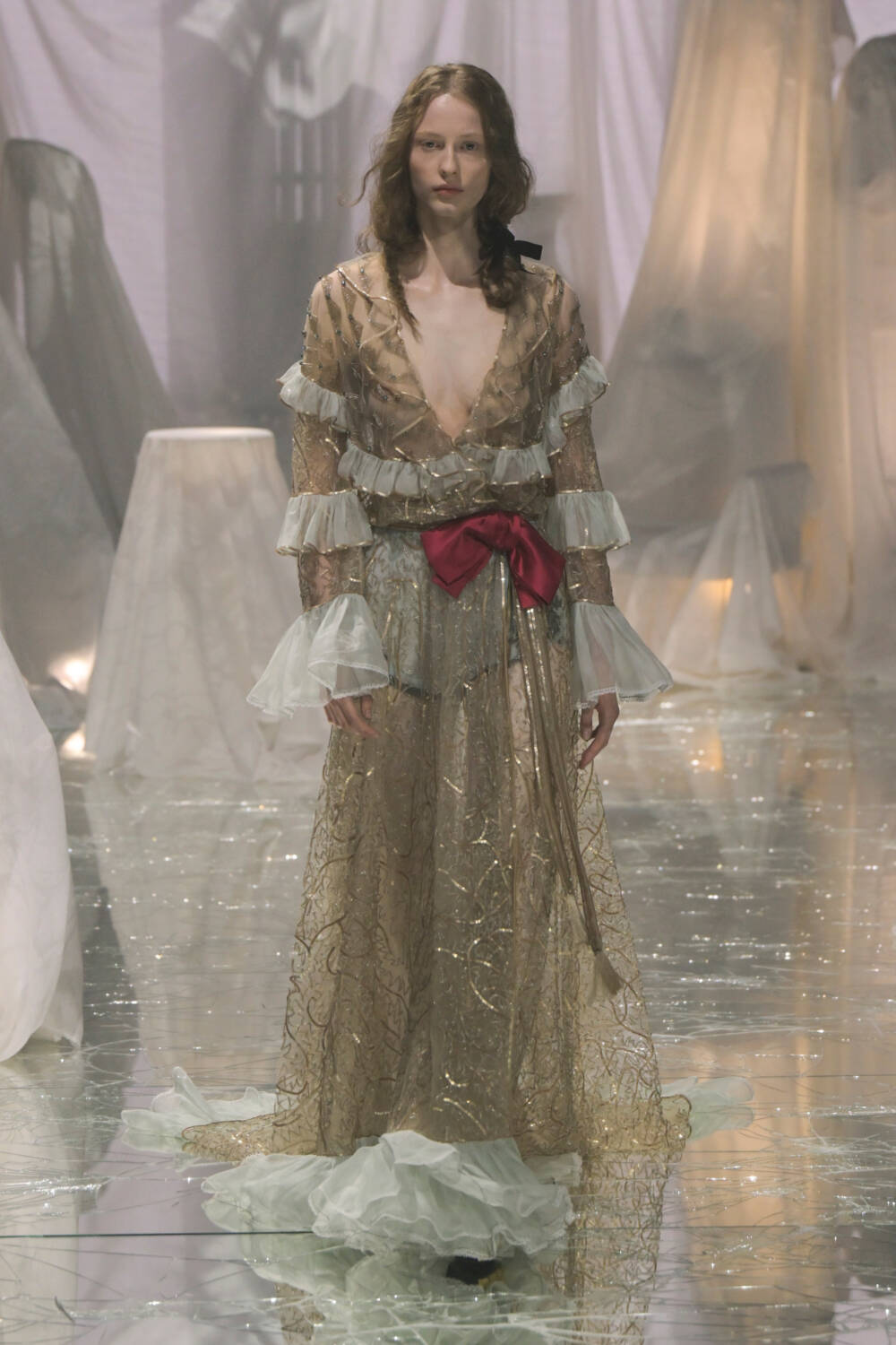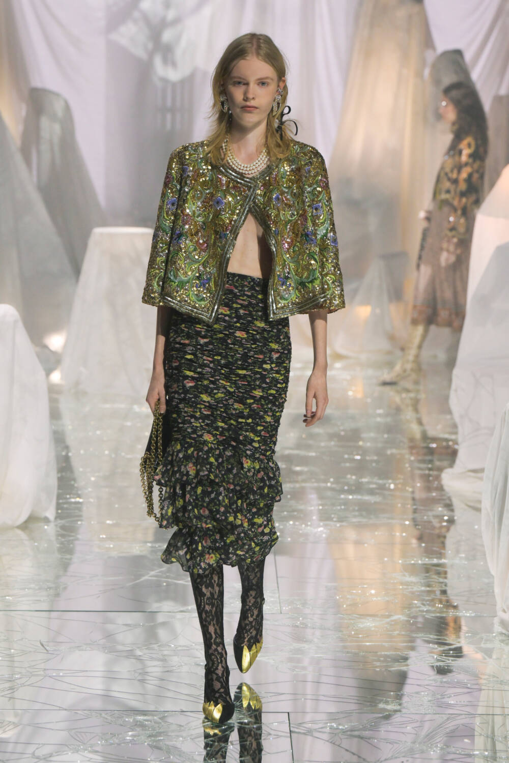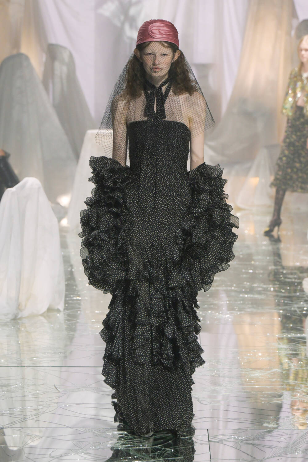 A vast room with a mirror cracked floor was filled with antiques covered in ghostly dust sheets – a metaphor perhaps for Michele’s archival approach of uncovering the treasures of the house and bringing them into a new era. The excitement built as Harry Styles, Florence Welch, Andrew Garfield, Carla Bruni, Elton John and David Furnish took their seats.
