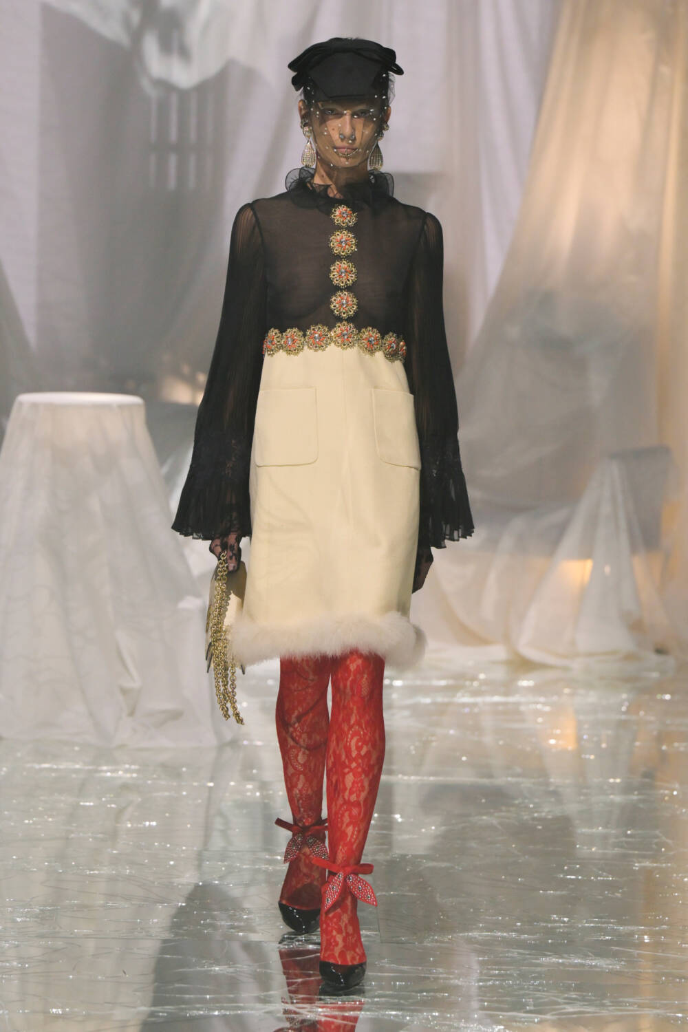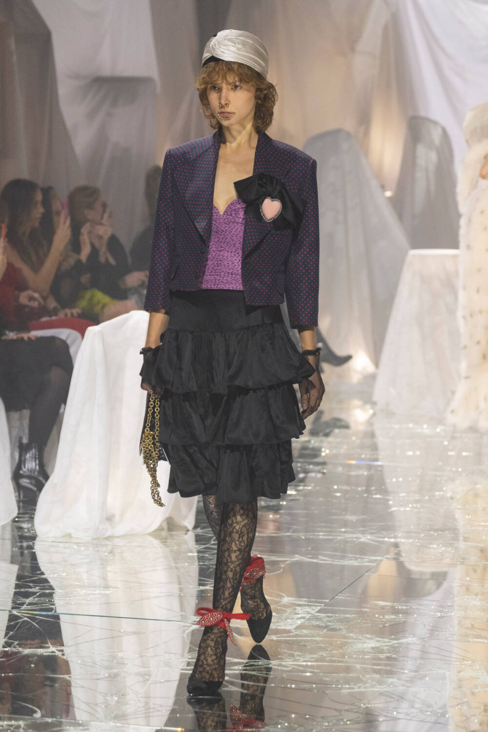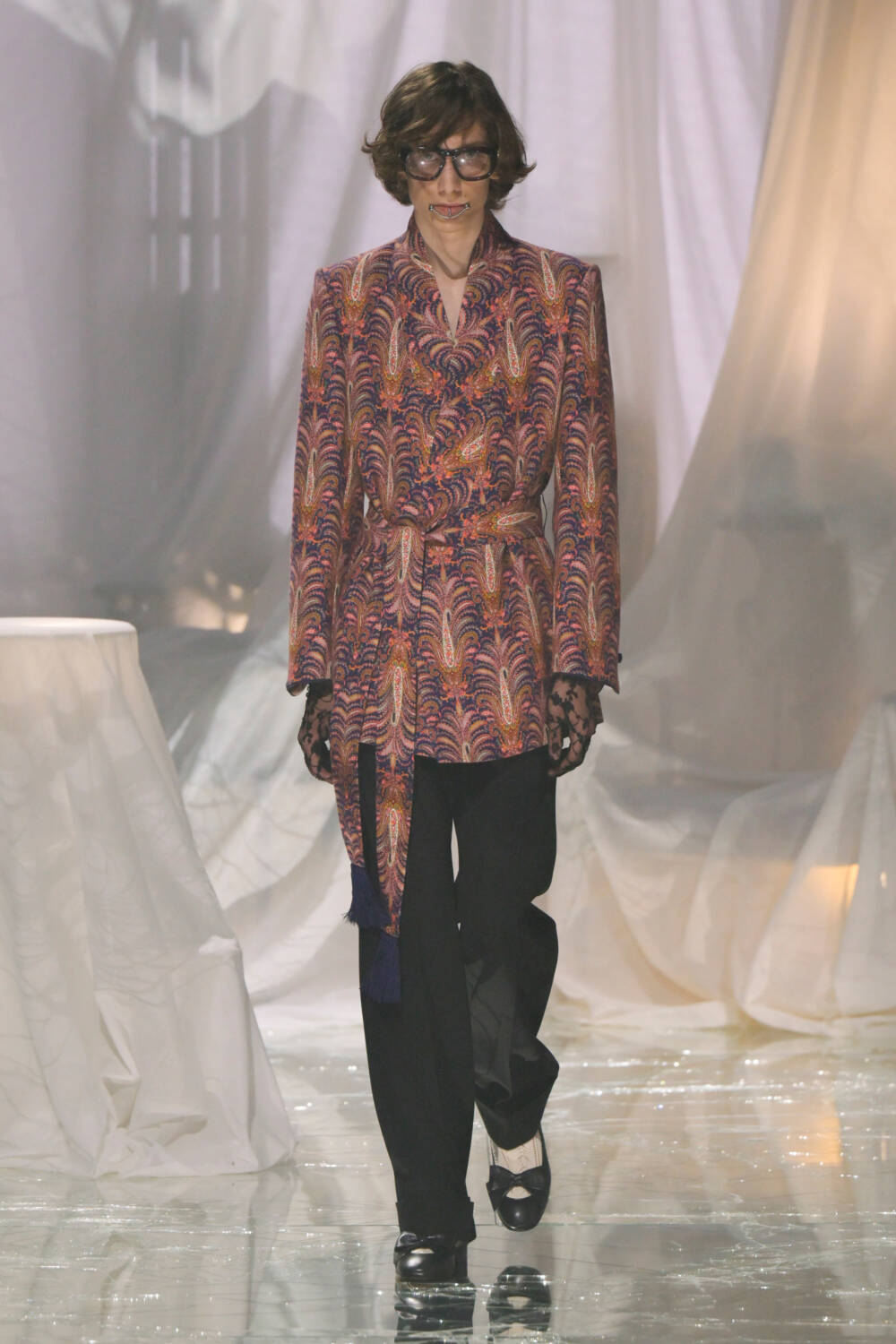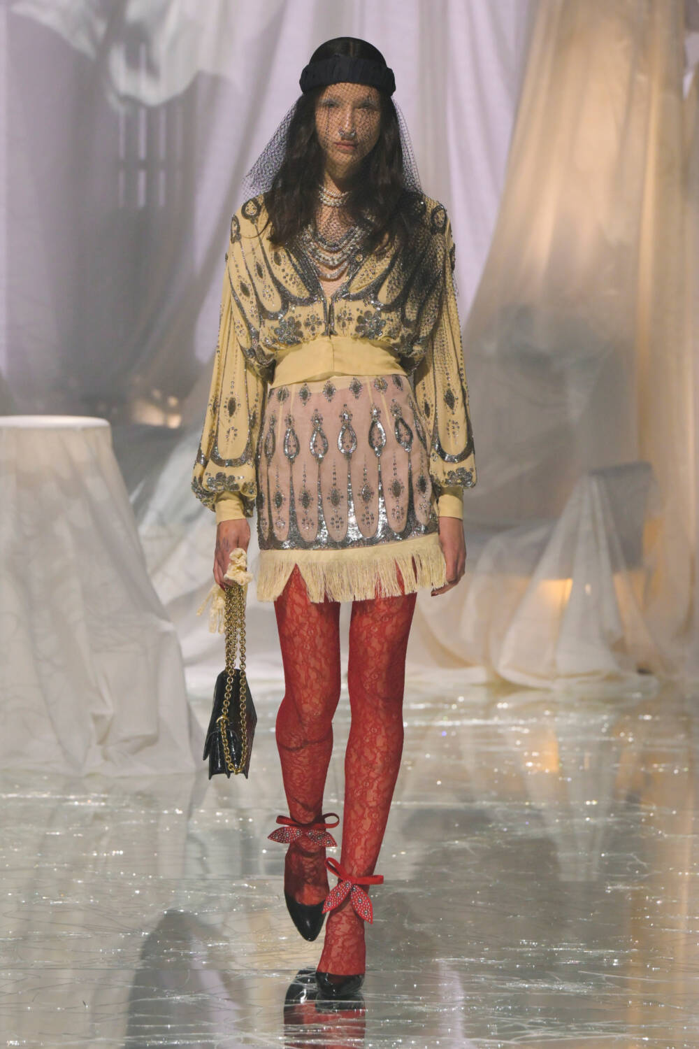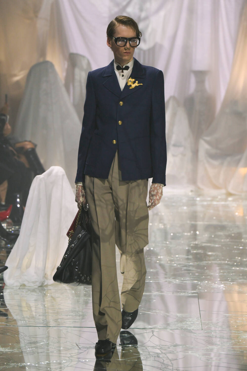 This was haute bourgeois dressing – beautiful clothes for beautiful lives – but with a maximalist, Michele twist. Michele’s young models wore pearl and crystal nose and mouth jewellery with their beautifully tailored finery, as well as lace gloves and little lady-like shoulder bags. The styling was intense – lace tights, gilded slingbacks, huge hats, veils, fringed shoppers, tassel belts, ballet pumps (for men and women), oversized beads and layered-up crystal jewels. “I wanted to tell a new generation, it’s possible to be weirdly chic in a disciplined or unruly way,” said the designer of his more-is-more style.