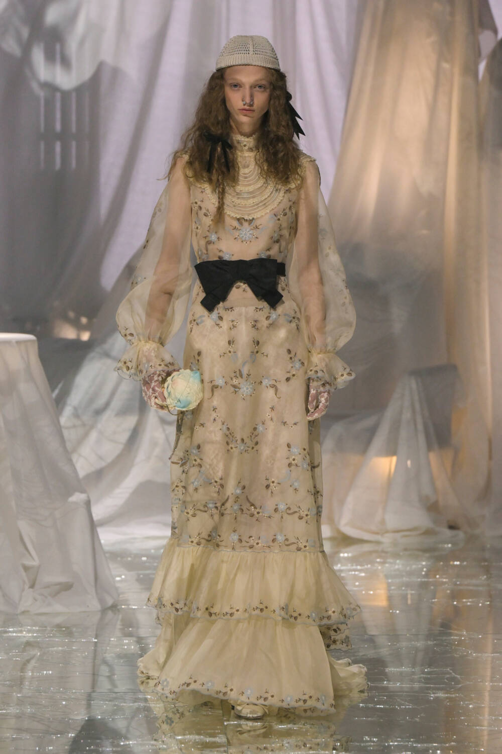 Then the new Michele era for Valentino began. From the very first look – a formal, wool, flounce-hemmed dress decorated with a white bib and black grosgrain bows, worn with red tights and crystal trimmed shoes – it was clear Michele would lean-in to Valentino’s couture house sensibility. He did just that with ruched polkadot flounced gowns that he later described as “beautiful like an explosion.” There was nothing ordinary about these sumptuous clothes. Lavishly sequinned and embroidered oriental jackets thrilled with hand-crafted detailing. Little sharp-shouldered sporty jackets (worn with jeans and flat ballet pumps) spoke to the discipline and finesse of the Valentino atelier. Decadent marabou stoles and oversized straw hats – the kind that they simply don’t make anymore were throwbacks to another time, when dressing-up was an important part of life. Michele cited the sixties, seventies and early eighties as his touch stone eras. Speaking after the show, he recalled visiting the Valentino archive on his very first day in the job, with his instinct drawing him towards pieces that were démodé or not in fashion. “I was looking for something that had been forgotten,” he said.
