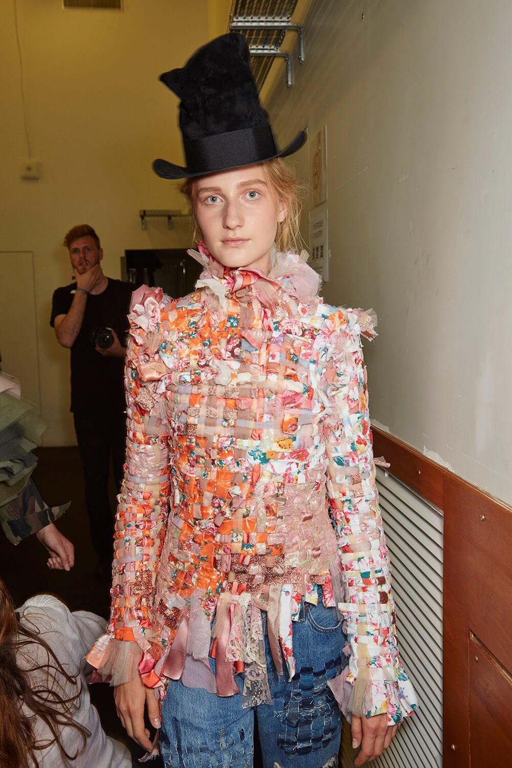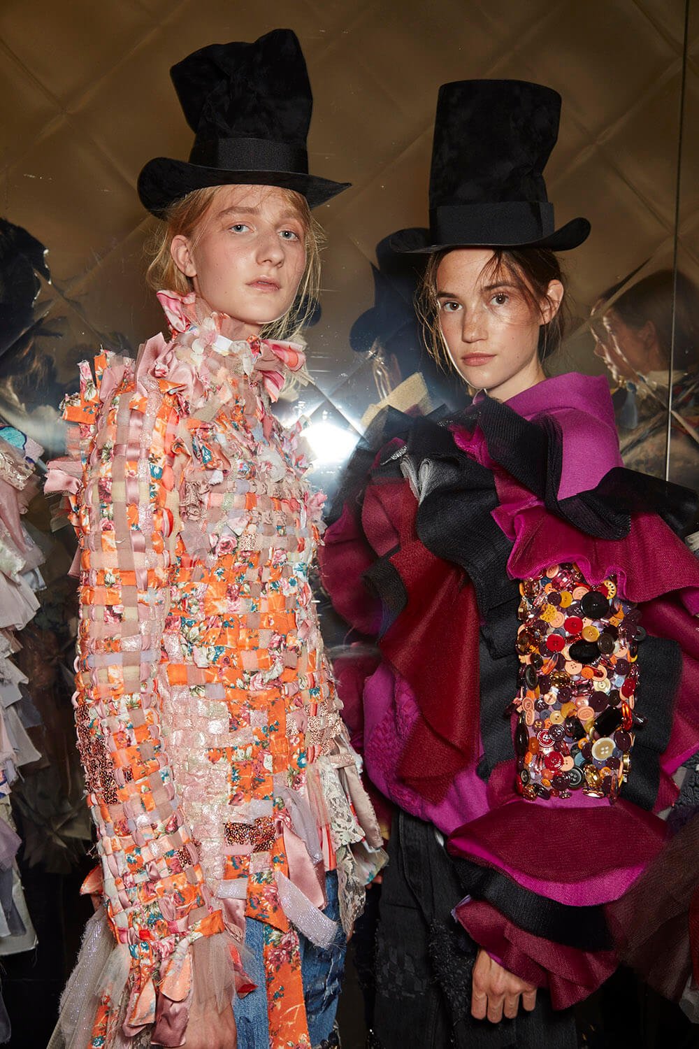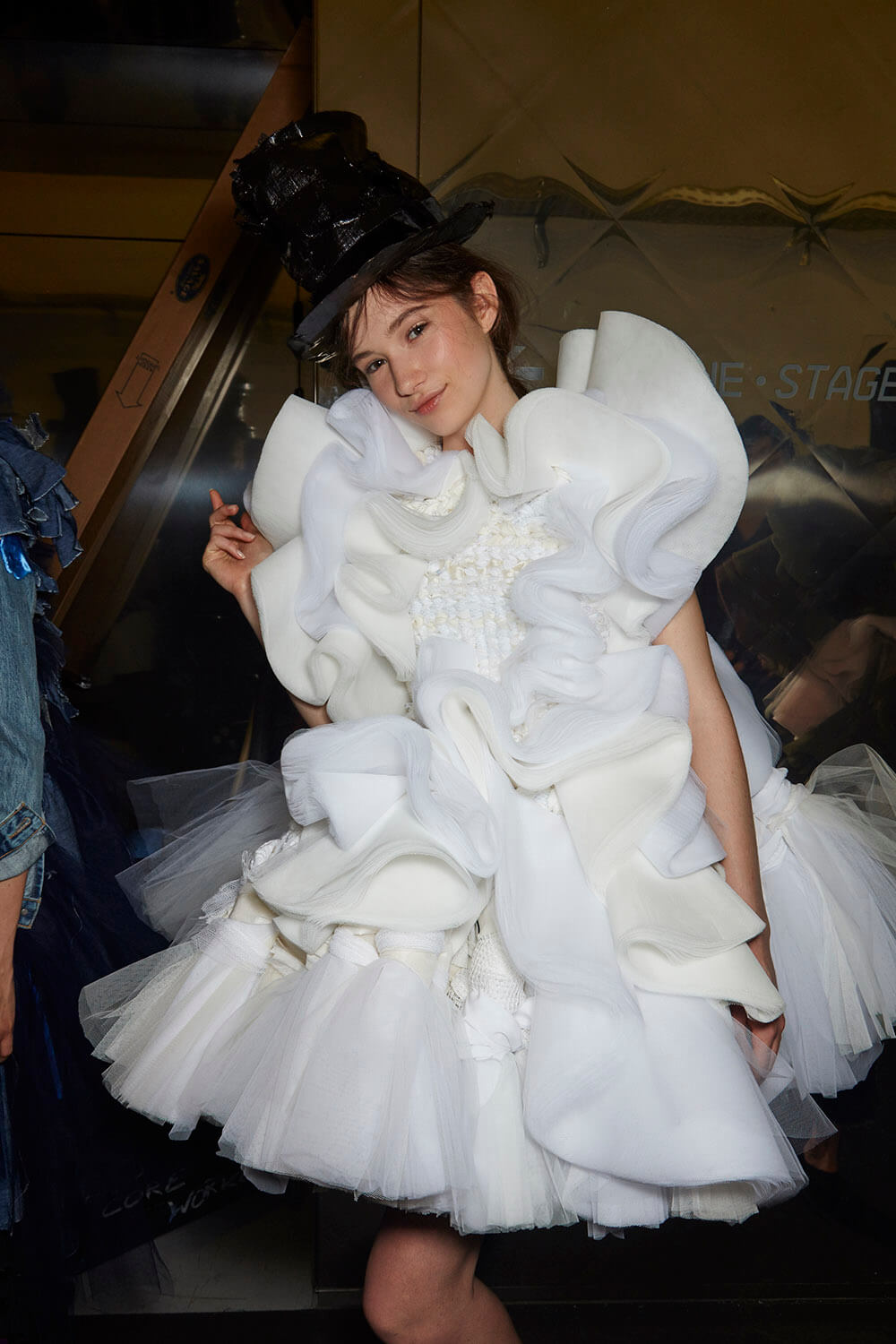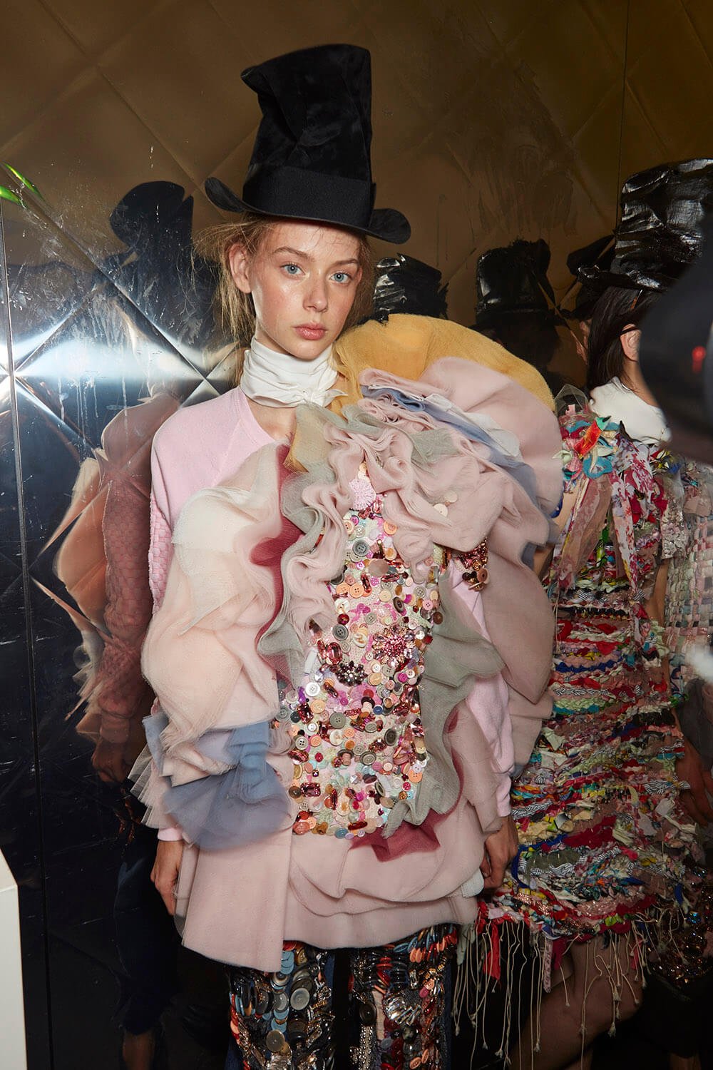 It was a case of haute recycling at Viktor & Rolf, being, as the collection was, made up of bits and pieces from a multitude of past ones. “Recycling as a means of expression,” apparently. And on the evidence presented, this was a very good idea. It made the collection feel at once looking backwards, built on mementos of the past, on the other, distinctly forward facing. A lesson in what can be done with your leftovers. Stick your hands in the discarded pile, boys and girls. Anyway, the look? Well, I couldn’t help but think it was a bit pearly queen. Eliza Doolitle before she got made posh. Those top hats, the stitched on embellishment that reminded of buttons, the full Victorian silhouette. But it was electrified with the pairs energy – giant explosions of tulle, fabrics weaves together by hand, the flash of a Coca Cola sweater. It was called Vagabonds, in reference to Dickens. “They belong nowhere, wandering from place to place, roaming the city,” says the release. At the end, the wanderers filled the stage. It was a breathtaking moment of craftsmanship. Magical, to say the least – a highlight of couture week so far.