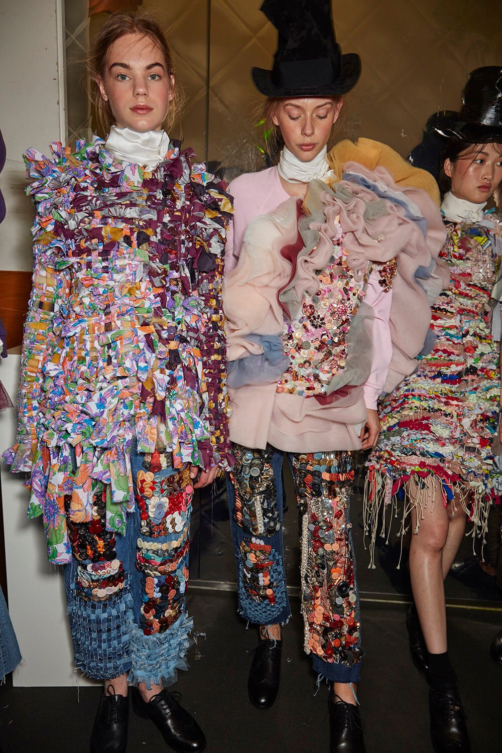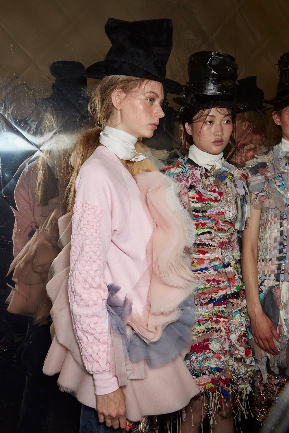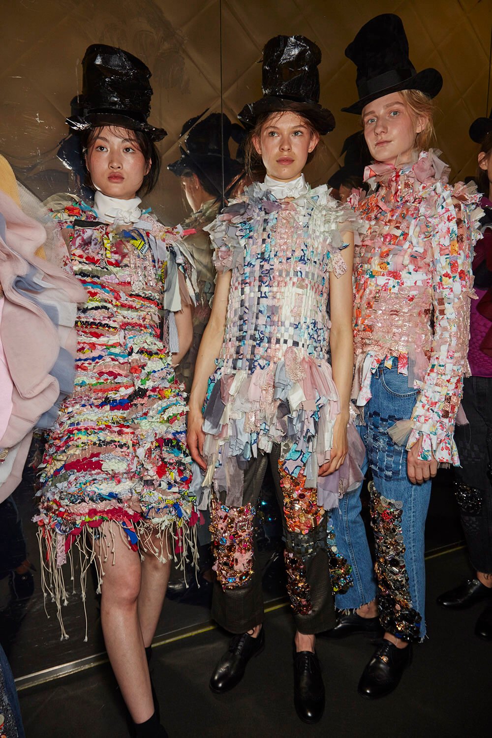 It was a case of haute recycling at Viktor & Rolf, being, as the collection was, made up of bits and pieces from a multitude of past ones. “Recycling as a means of expression,” apparently. And on the evidence presented, this was a very good idea. It made the collection feel at once looking backwards, built on mementos of the past, on the other, distinctly forward facing. A lesson in what can be done with your leftovers. Stick your hands in the discarded pile, boys and girls. Anyway, the look? Well, I couldn’t help but think it was a bit pearly queen. Eliza Doolitle before she got made posh. Those top hats, the stitched on embellishment that reminded of buttons, the full Victorian silhouette. But it was electrified with the pairs energy – giant explosions of tulle, fabrics weaves together by hand, the flash of a Coca Cola sweater. It was called Vagabonds, in reference to Dickens. “They belong nowhere, wandering from place to place, roaming the city,” says the release. At the end, the wanderers filled the stage. It was a breathtaking moment of craftsmanship. Magical, to say the least – a highlight of couture week so far.