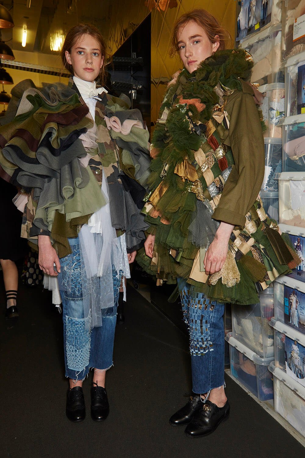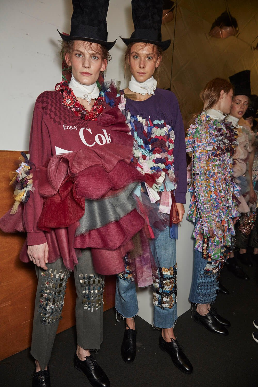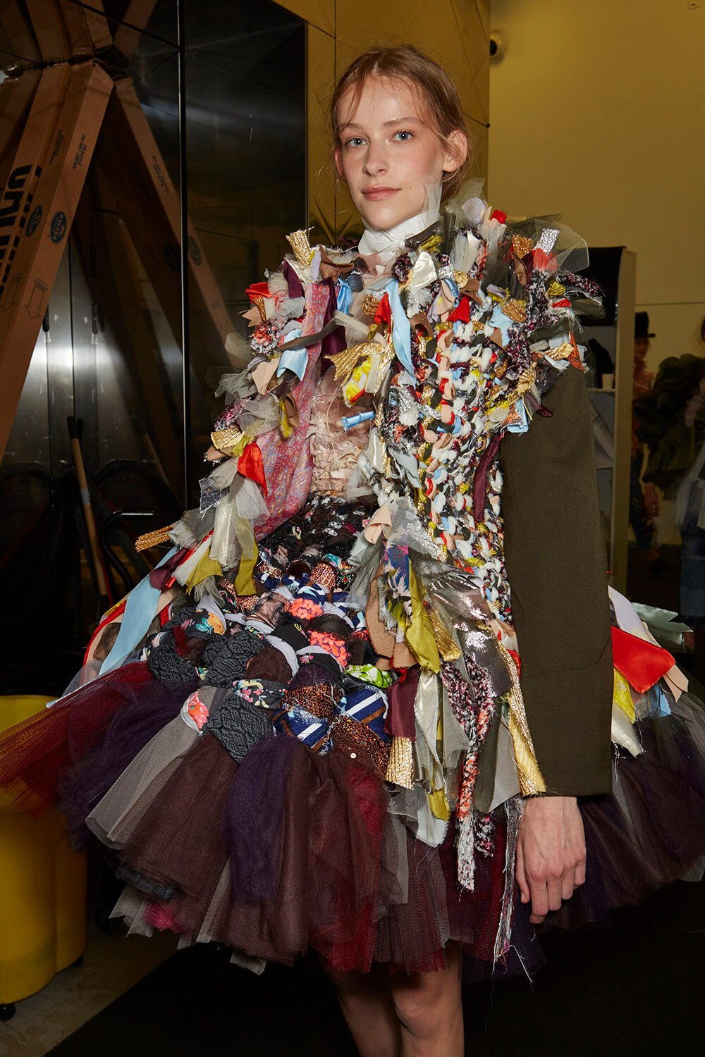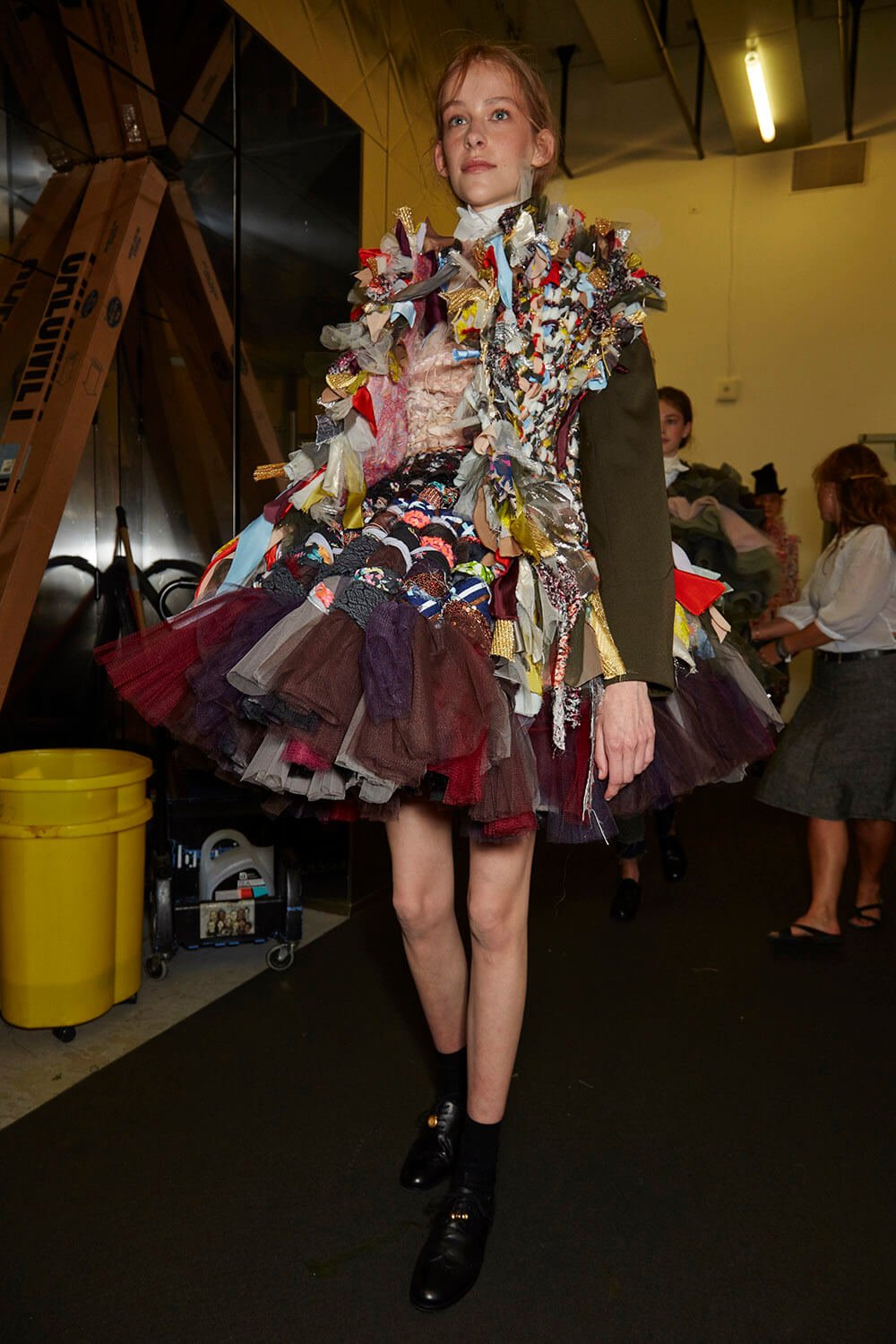 It was a case of haute recycling at Viktor & Rolf, being, as the collection was, made up of bits and pieces from a multitude of past ones. “Recycling as a means of expression,” apparently. And on the evidence presented, this was a very good idea. It made the collection feel at once looking backwards, built on mementos of the past, on the other, distinctly forward facing. A lesson in what can be done with your leftovers. Stick your hands in the discarded pile, boys and girls. Anyway, the look? Well, I couldn’t help but think it was a bit pearly queen. Eliza Doolitle before she got made posh. Those top hats, the stitched on embellishment that reminded of buttons, the full Victorian silhouette. But it was electrified with the pairs energy – giant explosions of tulle, fabrics weaves together by hand, the flash of a Coca Cola sweater. It was called Vagabonds, in reference to Dickens. “They belong nowhere, wandering from place to place, roaming the city,” says the release. At the end, the wanderers filled the stage. It was a breathtaking moment of craftsmanship. Magical, to say the least – a highlight of couture week so far.