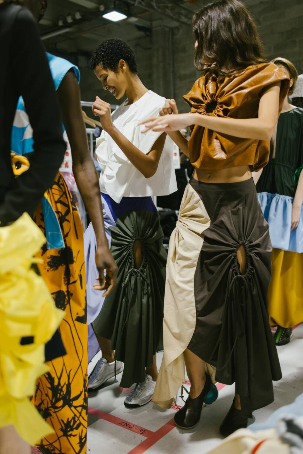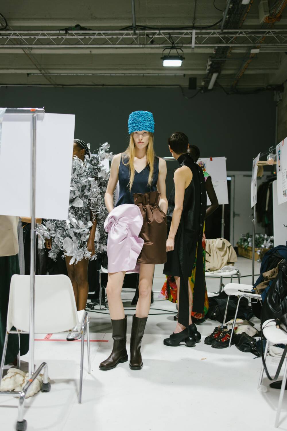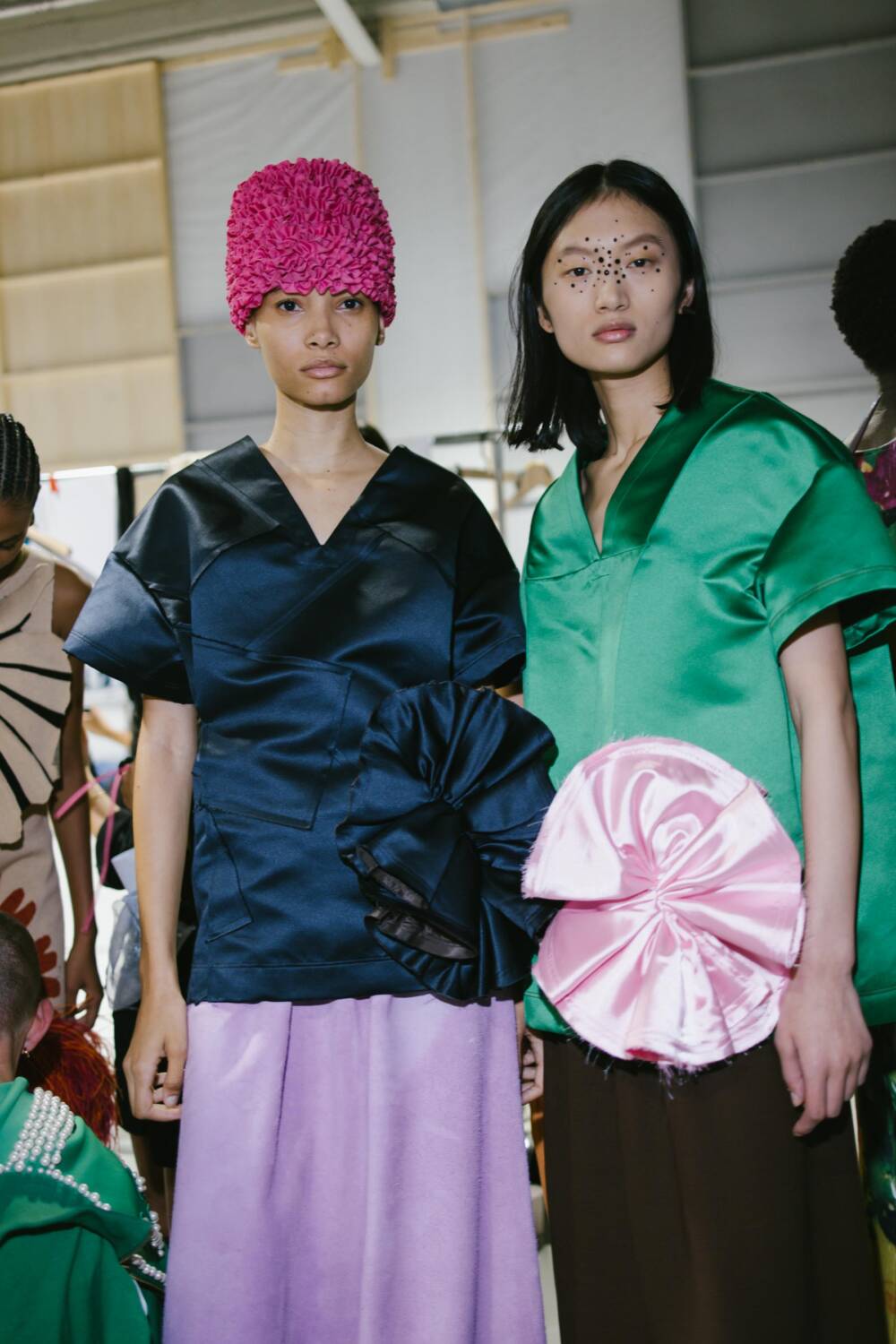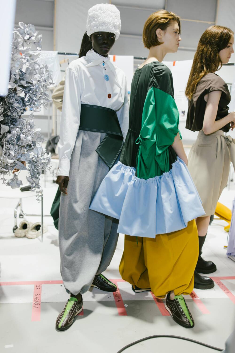 As models traversed the runway, dressed in lovely clothes with ruched textures, gliding across the ash grey floors, a wide array of elegant and expressive pieces emerged. The creative director pair decked out pieces with panoplies of ruffles, resulting in a number of skirts that materialised with voluminous layers. Bold and contrasting colours it up the catwalk. Think forest green puff-sleeve blouses and brown balloon trousers, embellished with an oversized satin flower brooch, and exciting ruffled bucket hats in vivid hot pinks and azure blue. Contemporary clothes and experimental silhouettes merged with an avant-garde sense of sophistication. Each look that flaunted the runway was decadent, with Danial and Imruh’s proving themselves to be visionaries.